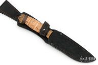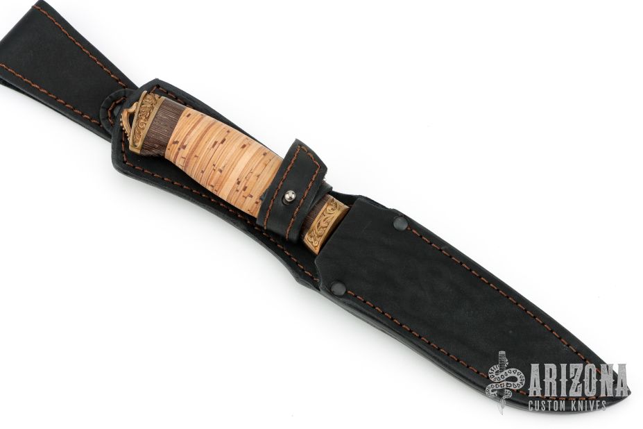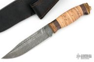 This Voykar HT by Olamic Cutlery has a H.C.V.D. Damascus blade stamped #373, has fullers and a clip point, .169" blade stock and 1.278" blade depth, hidden tang construction. The handle has a cast bronze guard and butt with lanyard hole, stacked birchbark grip with wenge wood spacers. Includes a black leather sheath with belt loop and zippered case.  Excellent condition.