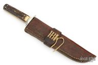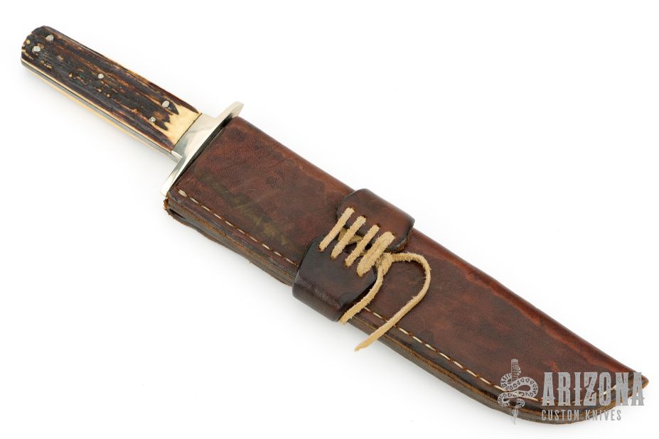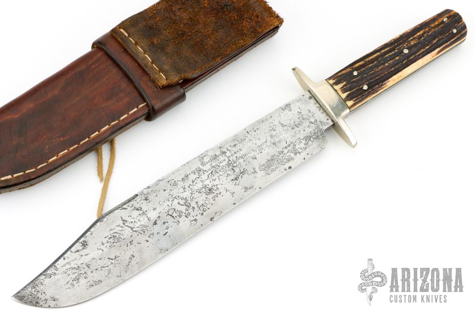 This Antique Bowie by George Wostenholm and Son features a satin finished blade with false top edge, .227" blade stock and 1.872" blade depth, full tapered tang construction. The handle has a nickel silver guard, stag scales and nickel silver pins. Comes with a brown leather sheath. Has some scratches and pitting on the blade, otherwise good condition for its age. Comes with a zippered case.