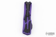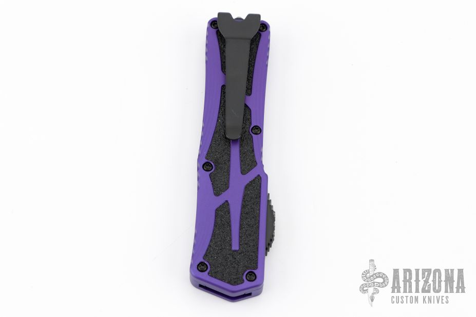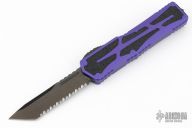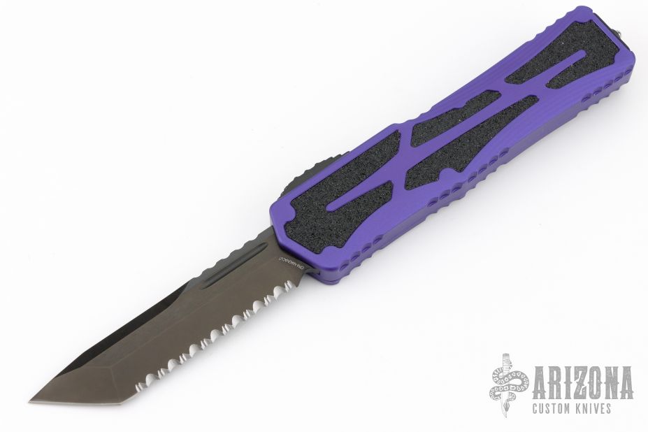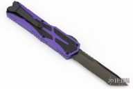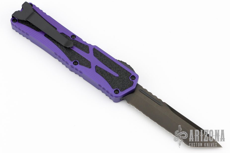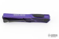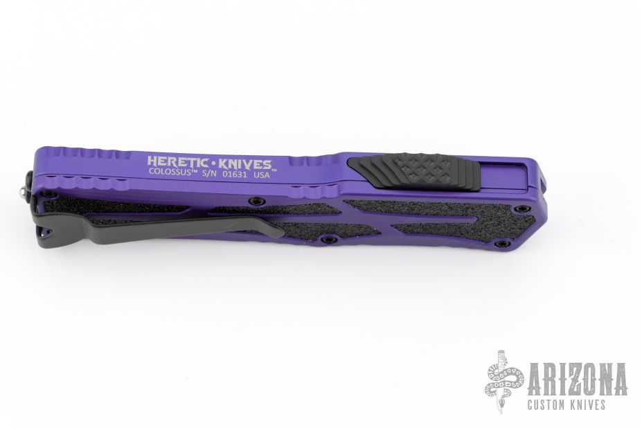 This Colossus by Heretic Knives features a DLC partially serrated tanto blade with fullers and notched thumbrest. The handle has a purple aluminum frame with non-slip inlays, checkered thumb slide, stainless steel tip down clip. Comes with original box and lube. S/N 01631. Excellent Condition.