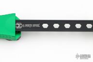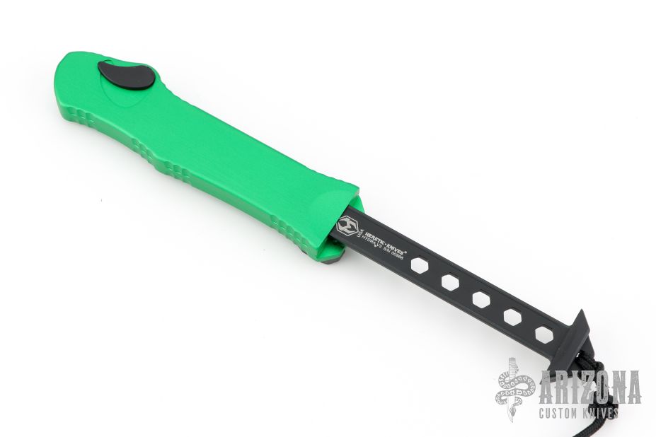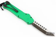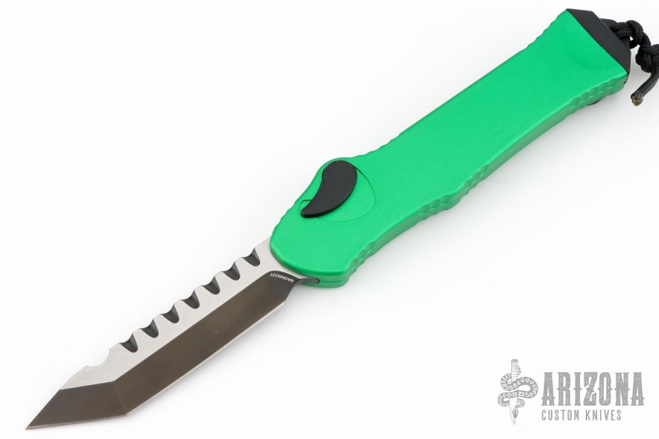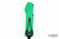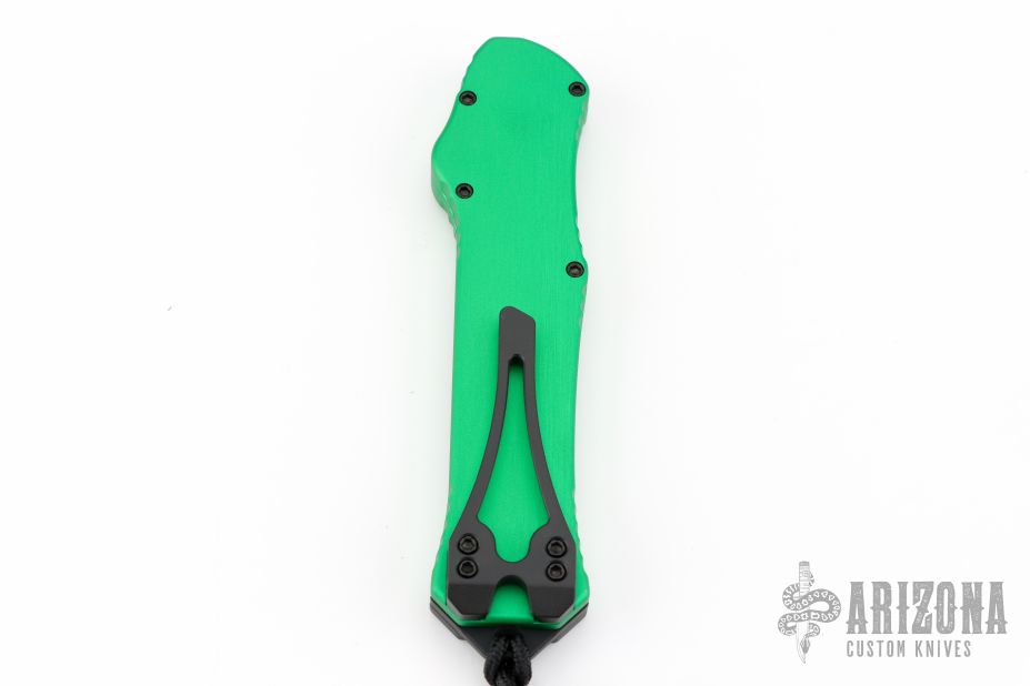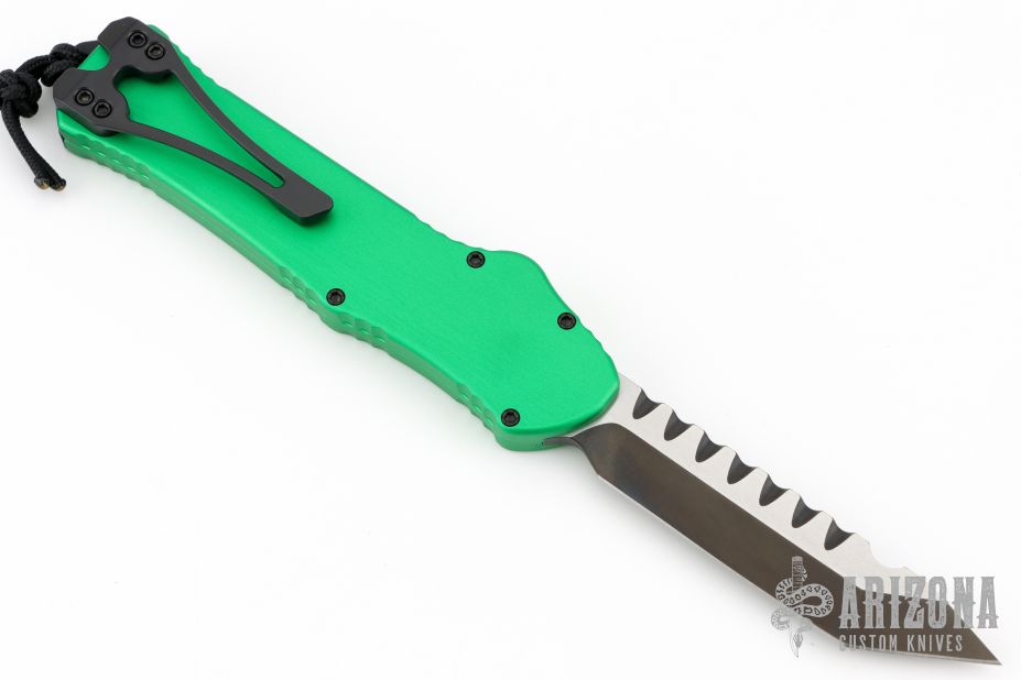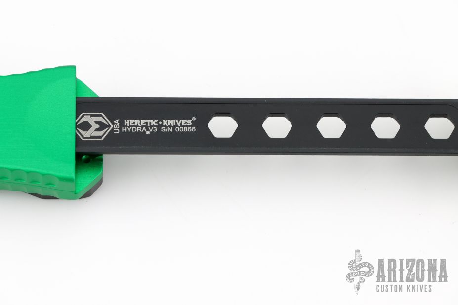 This Hydra by Heretic Knives (Anthony G. Marfione) features a two tone black tanto blade. The handle has a toxic green aluminum frame, stainless clip, black charging handle. Comes with original box and lube. S/N 00866. Excellent condition.