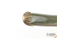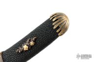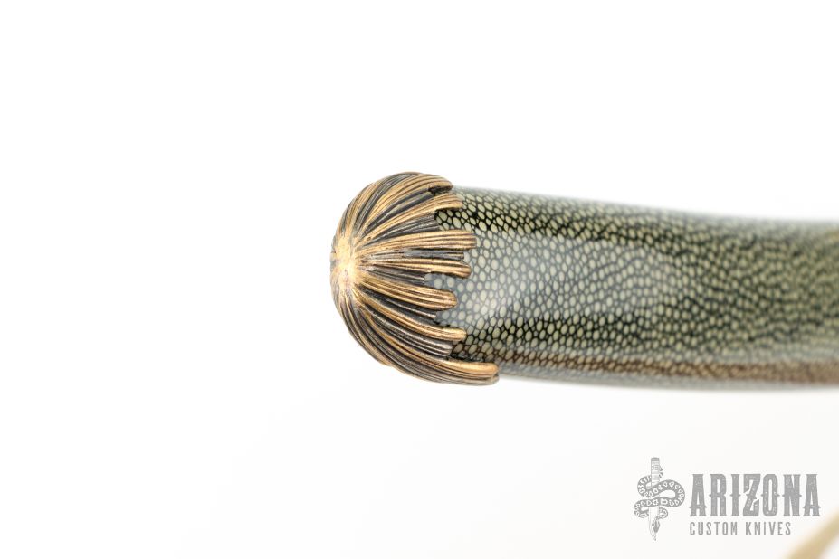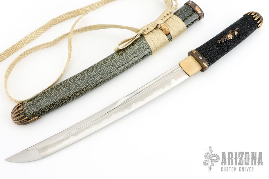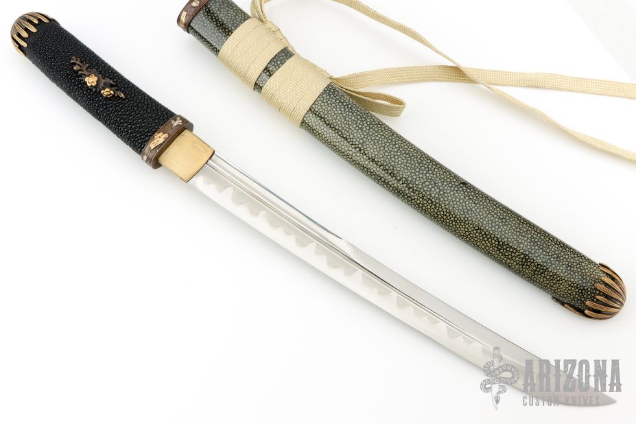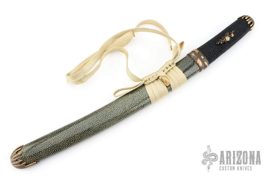 This Japanese Tanto features a hand rub satin finished blade with beautiful hamon and fullers, false top edge, .255" blade stock and 1.085" blade depth, hidden tang construction. The handle has a brass habiki, copper tsuba with engraved edges and silver and gold inlays, carved copper butt with gold inlays, stingray skin grip with copper menukis that have gold inlays. Comes with a stingray skin saya with beautiful clear coat finish, copper collar and tip with gold and silver inlays. Excellent condition. Comes with a silk sword bag and a zippered case.