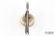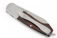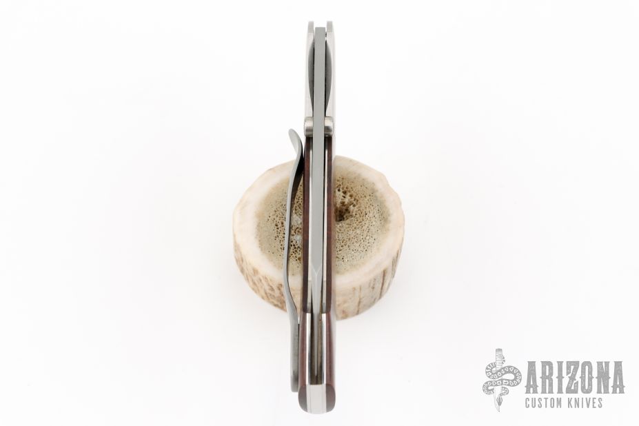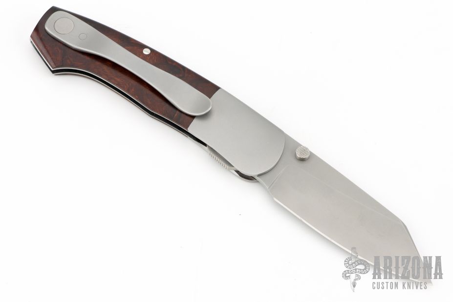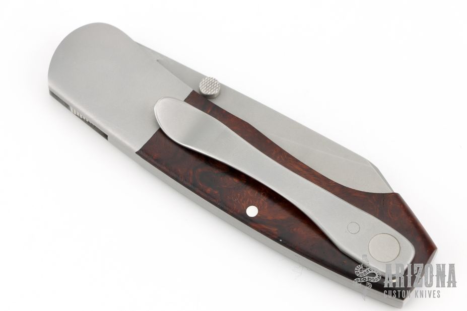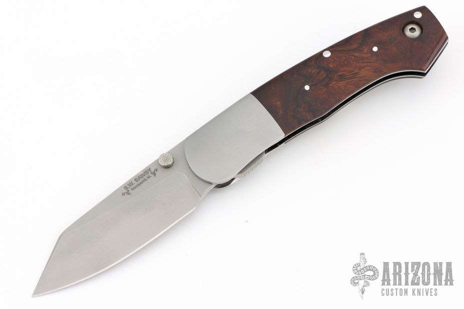 This Scott Sawby Combat Utility folder has his patented self lock system. The blade is bead blasted with dual thumbstuds. The handle has dovetailed bead blasted stainless steel bolsters with integral liners, Desert Ironwood Burl scales, tip up bead blasted stainless steel clip and backspacer, clip is left/right reversible. Has a couple light scuffs, otherwise excellent condition. Comes with a Velcro case.