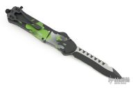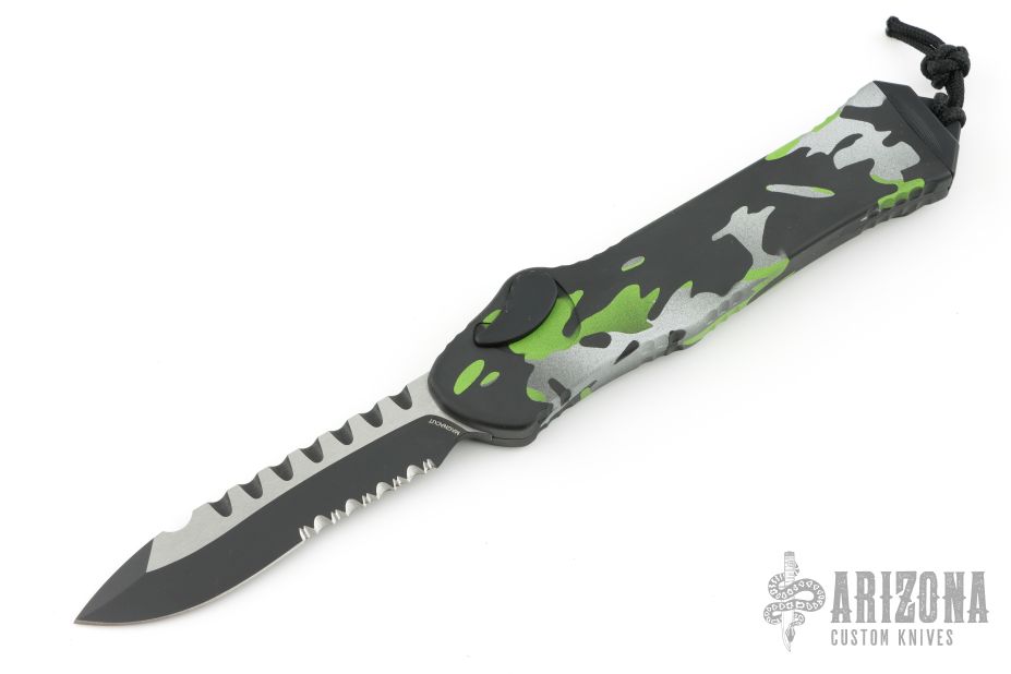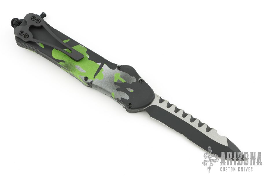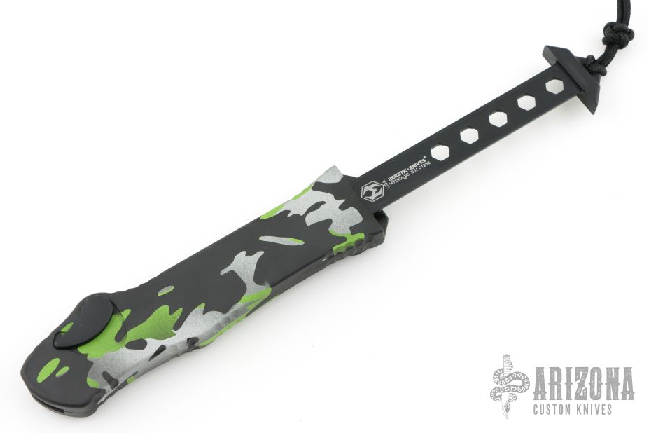 This Hydra by Heretic Knives features a two-tone recurve blade with partial serrations. The handle has a camo aluminum frame, black stainless clip. Includes the original box. Includes the original box. Excellent Condition.