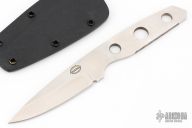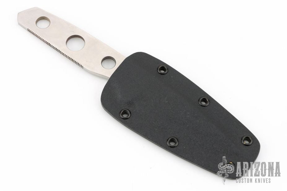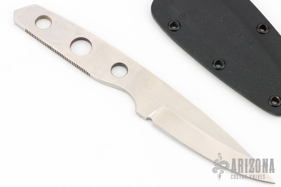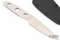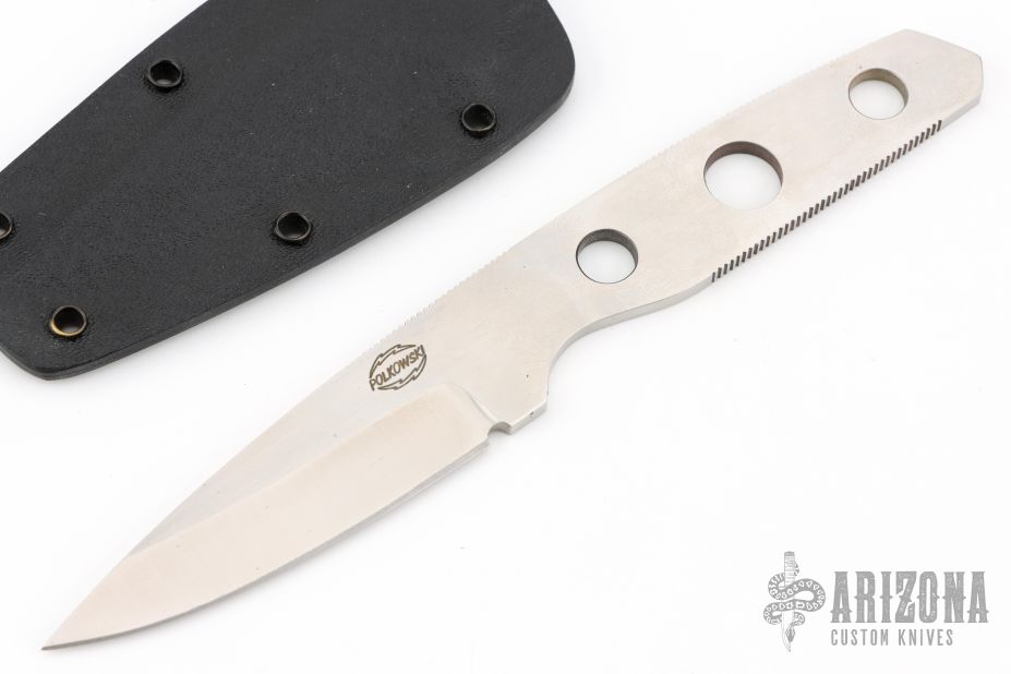 This neck knife by Al Polkowski has a satin finished blade with notched thumb and tang, .145" blade thickness and .995" blade depth, full tang construction. Comes with a kydex sheath. Has a couple light scratches, otherwise excellent condition.