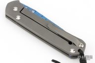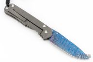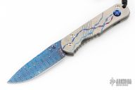 This Regular Large Sebenza by Chris Reeve Knives features a Devin Thomas Blued Spirograph Damascus blade with single thumbstud, and notched thumbrest. The handle is titanium with engraving on one side and bead blast titanium with bead blast titanium clip, tip up carry. Has a blue star sapphire inlay. Has titanium barrel spacer. Nice detent, lockup and blade seating. Comes with original box, papers dated December 20, 1999, RIG (rust inhibiting grease) and leather sheath. Excellent condition.