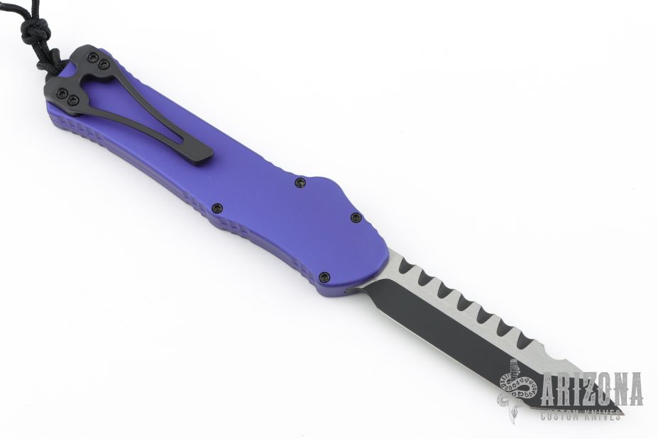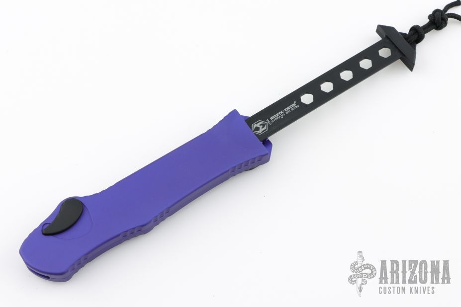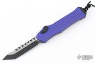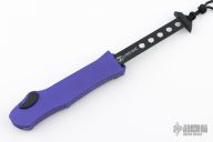 This Hydra by Heretic Knives (Anthony G. Marfione) features a two tone black tanto blade. The handle has a purple aluminum frame, stainless clip, black charging handle. Comes with original box and lube. S/N 00783. Excellent condition.