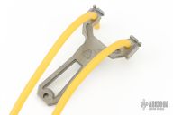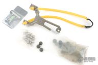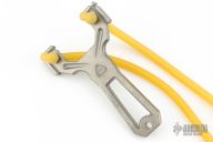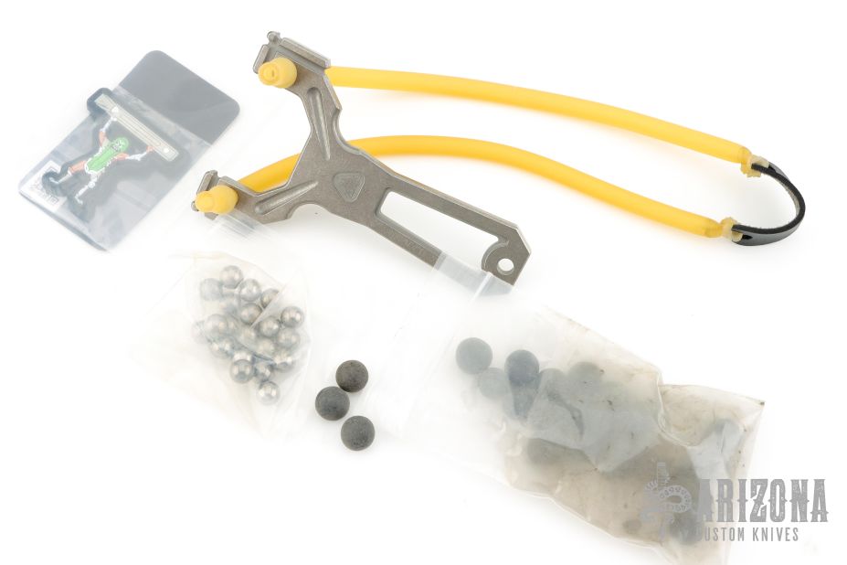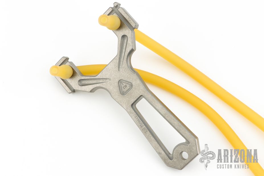 This Slingshot by Zach Wood is made from titanitum and is .263" thick and 5.5" tall. It has a replaceable rubber and leather sling. Comes in maker's wooden packaging, with extra shot, patch, and maker's card. Excellent/unused condition.