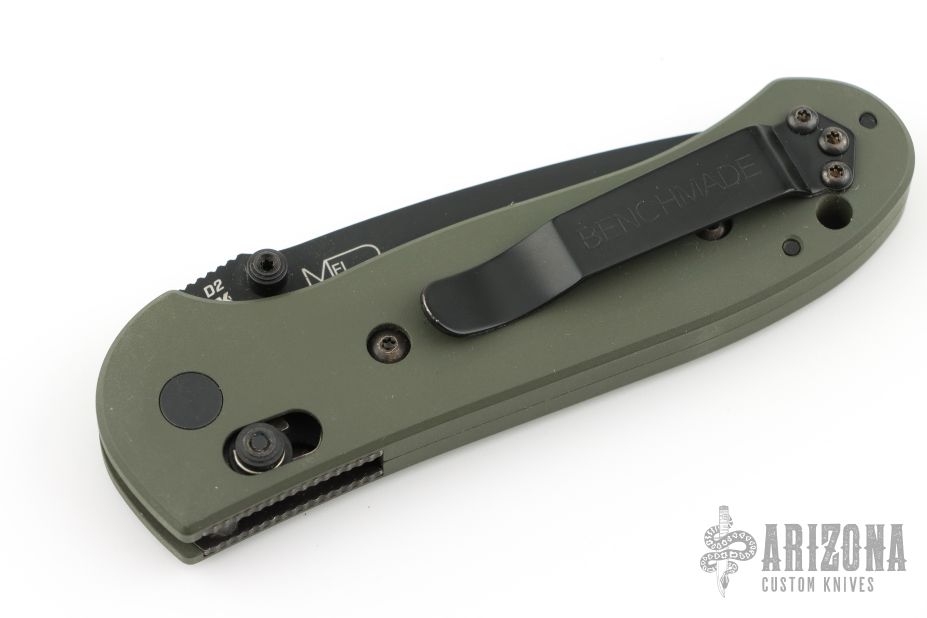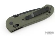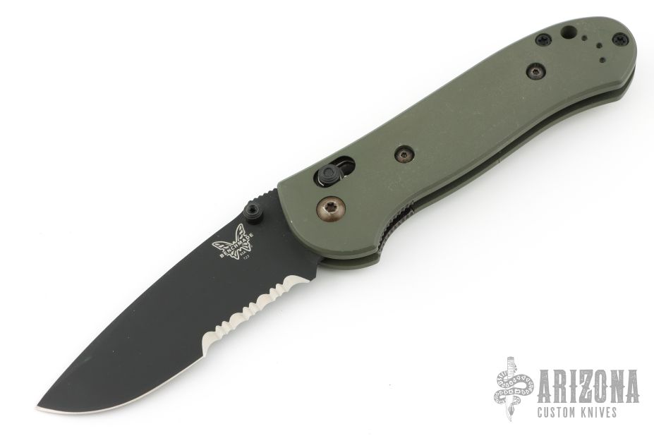 This Benchmade 723 SBK features a black coated and partially serrated D2 blade, and forest green aluminium handle with black stainless liners. Notched thumb rest. Limited edition run marked 28/700. The consignor mentions this knife was produced for/from the 2008 SHOT Show. Has some light scuffs and scratches, great condition otherwise.