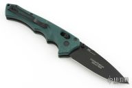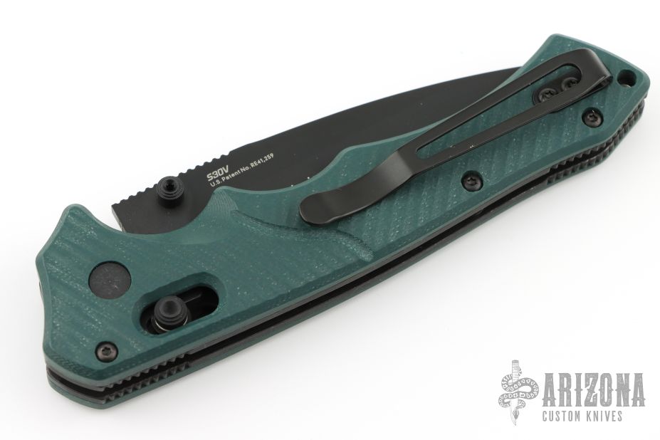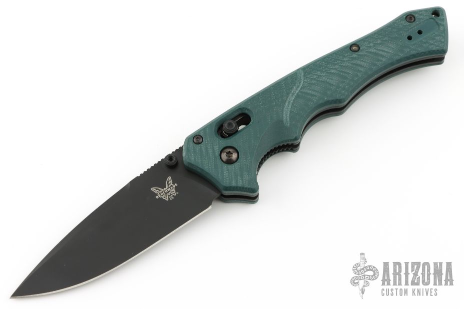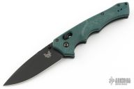 This 615BK-1501 Mini Rukus from Benchmade features a black coated drop point blade with swedge, notched thumb rest and dual thumb studs. The handle is comprised of green G10 over black stainless steel liners and black barrel spacers. Two way tip up carry pocket clip. Features the patented "Axis Lock". Marked "Limited Edition 383 of 1000" on blade. Has some light scuffs and scratches on the clip. Excellent condition otherwise. Consignor mentions that this knife was produced for/from the 2015 SHOT show.