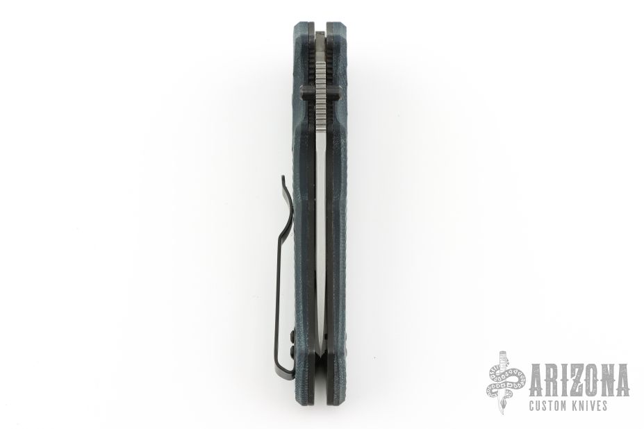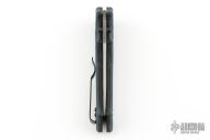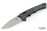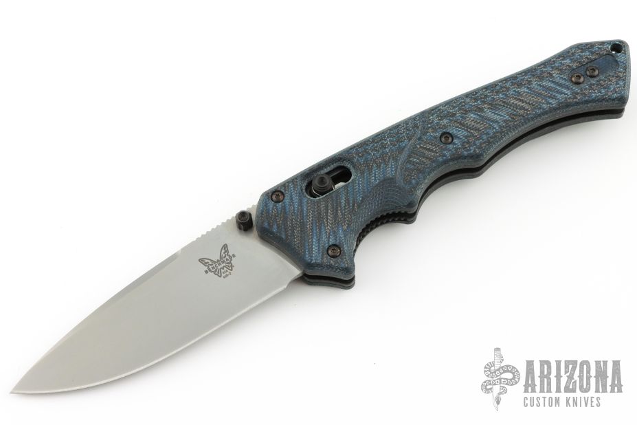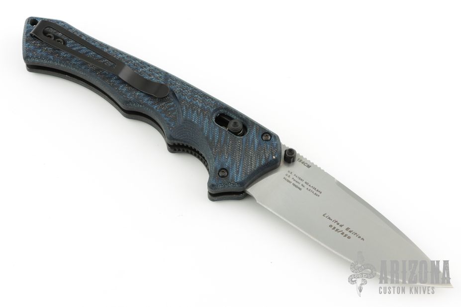 This Assisted Opening Mini-Rukus by Benchmade features a matte finished blade with false top edge. The handle has black/blue G-10 scales over a black steel liners with a black stainless steel tip up clip. Has a couple light scuffs and scratches, excellent condition otherwise. The consignor mentions this knife was produced for/from the 2009 SHOT Show.