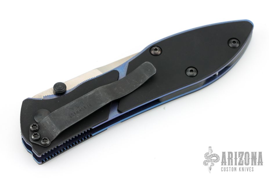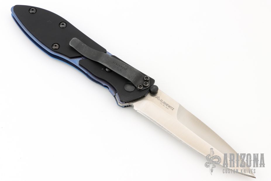 Benchmade 875 Elishewitz Sentinel. Has a satin finished spear point blade. Anodized titanium frame with 2 piece black aluminum scales. Black stainless steel clip for tip down carry. Has some scuffs and scratches, great condition otherwise.