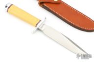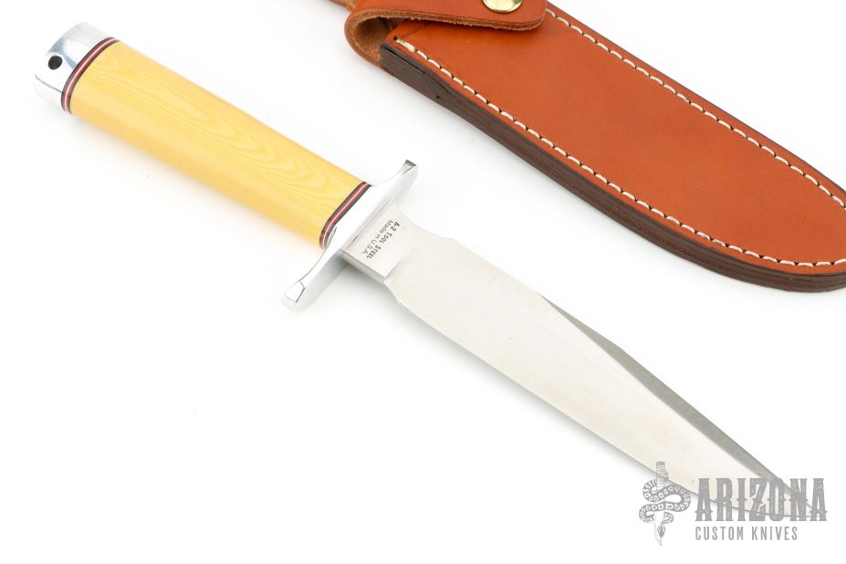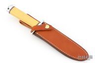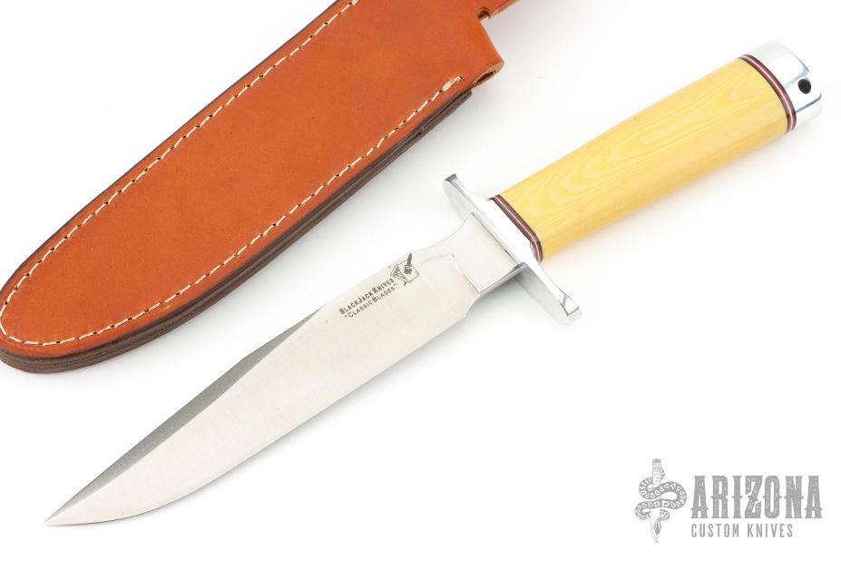 This Model 1-7 by Blackjack Knives features a satin finished blade with false top edge, .217" thick and 1.210" deep, hidden tang construction. The handle has an aluminum guard and butt with lanyard hole, antique ivory paper micarta grip with red/white/black/leather spacers. Comes with a brown leather sheath and a zippered case. Has a couple light scratches on the blade, otherwise excellent condition.