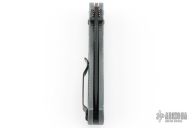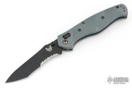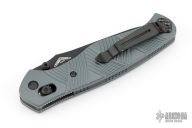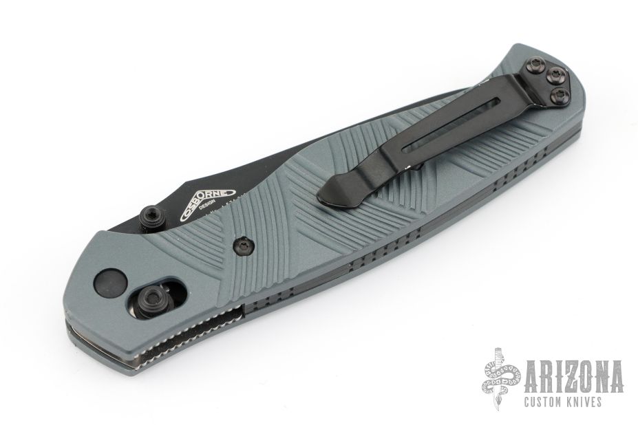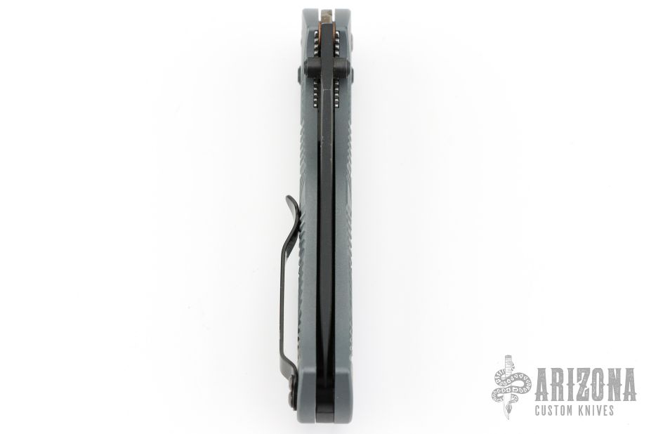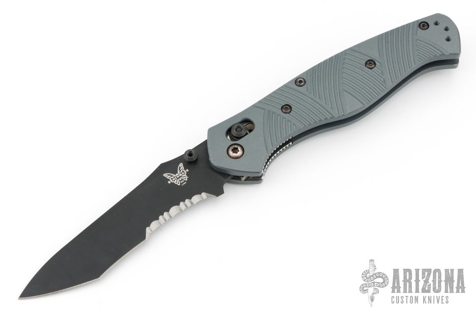 This Gaucho Axis lock folding knife by Benchmade features a black tanto blade with dual thumbstuds and serrations. The handle has grey textured aluminum scales, stainless steel liners and black stainless steel tip up clip. Limited Edition #271 of 300. Has some light scuffs, excellent condition otherwise.