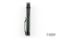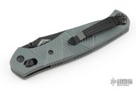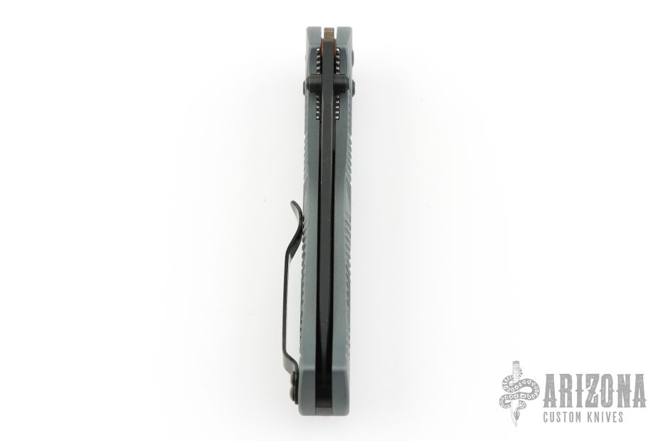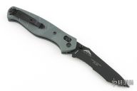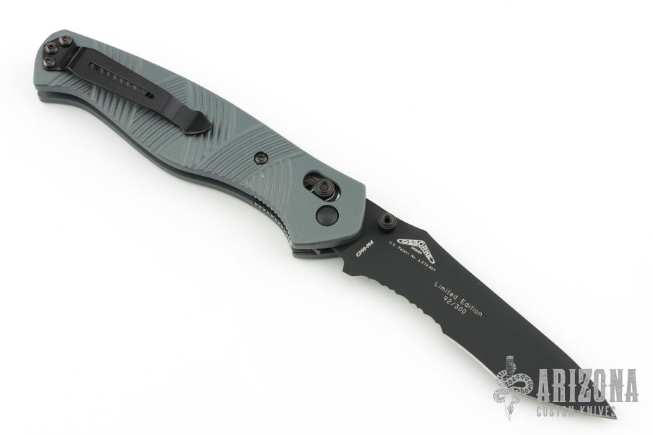 This Gaucho Axis lock folding knife by Benchmade features a black tanto blade with dual thumbstuds and serrations. The handle has grey textured aluminum scales, stainless steel liners and black stainless steel tip up clip. Limited Edition #292 of 300. Has some light scuffs, excellent condition otherwise.