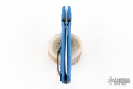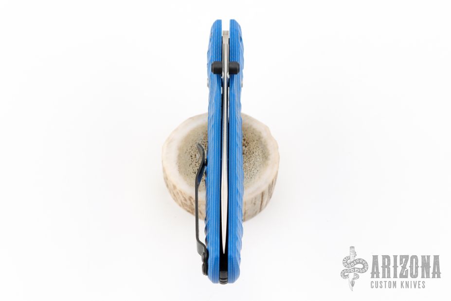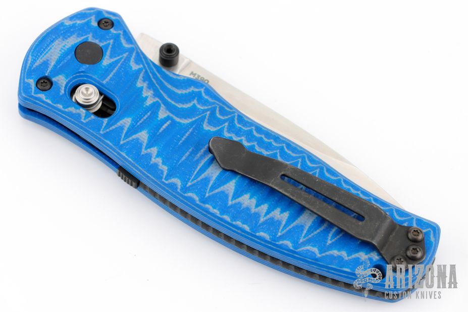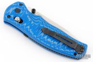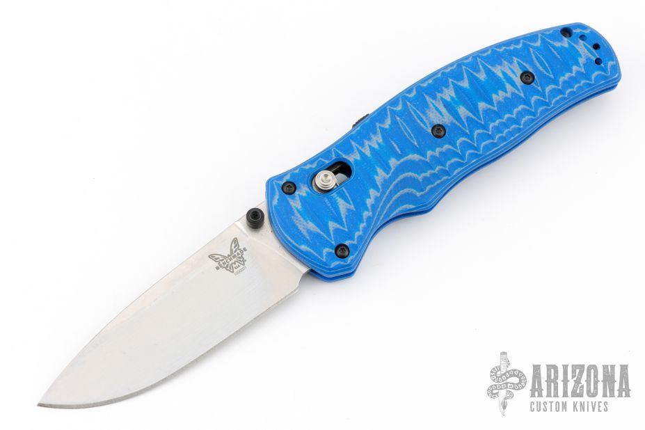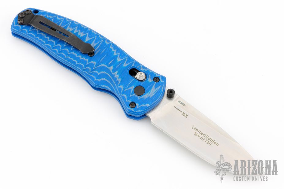 This 1000001-1601 Volli by Benchmade features a stonewashed drop point blade with swedge and dual thumb studs. The handle is comprised of carved and contoured blue/grey G-10 scales over a black coated steel sub frame and notched black G10 backspacer. Sliding safety on spine. Assisted opening with AXIS lock. Limited edition 169/750. Has a couple light scuffs, excellent condition otherwise.