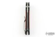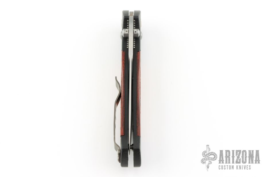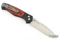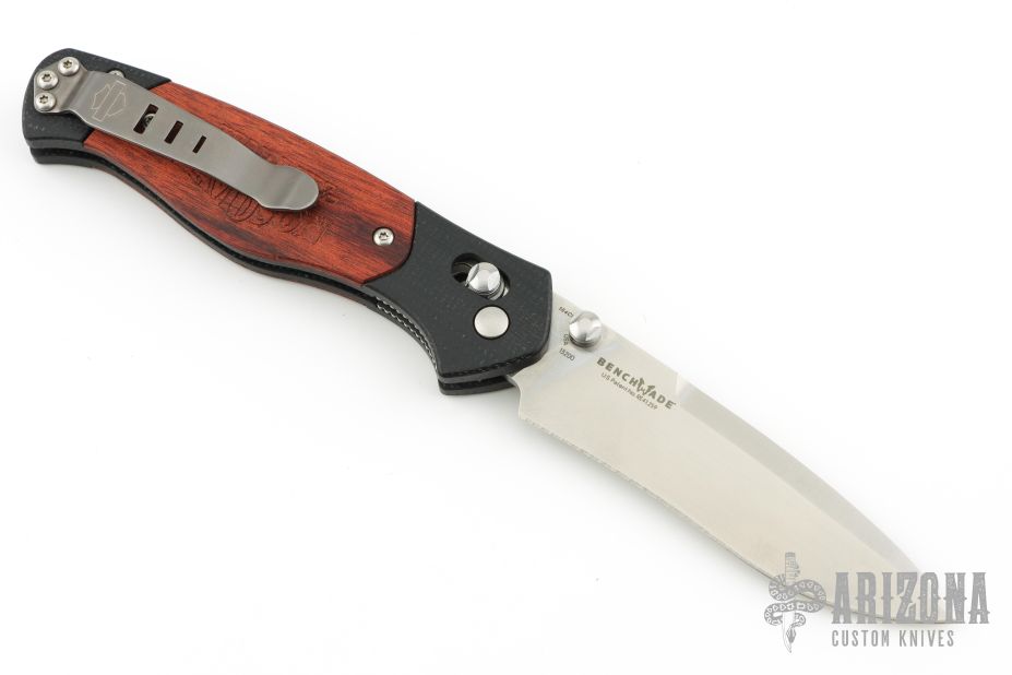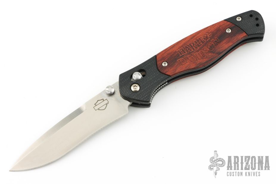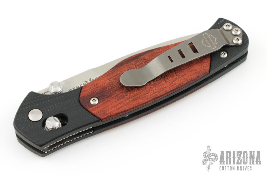 This axis-lock by Benchmade for Harley Davidson features a bead blast finished recurve spear point blade with dual thumb studs. The handle is composed of G10 covers with Winewood inlay, stainless liners, notched thumb rest, and a black steel tip up pocket clip. Has some light scuffs and scratches, excellent condition otherwise.