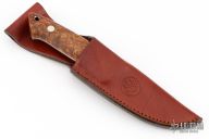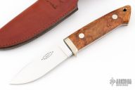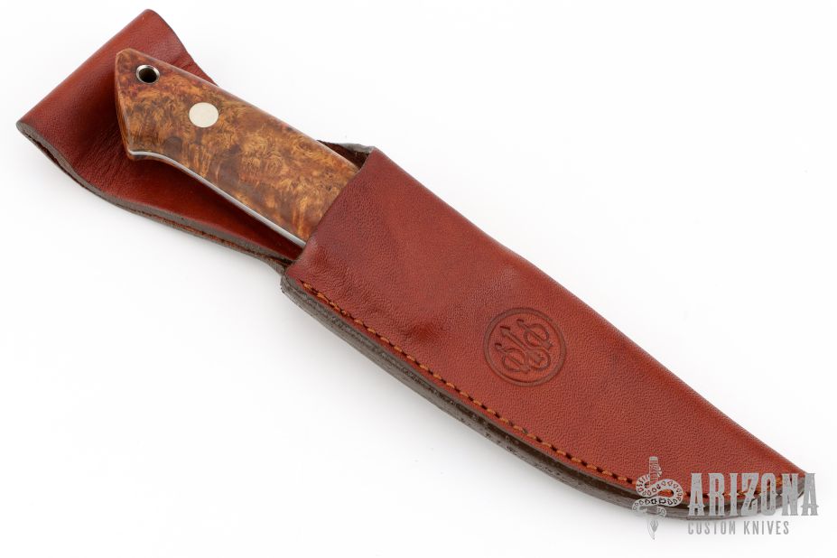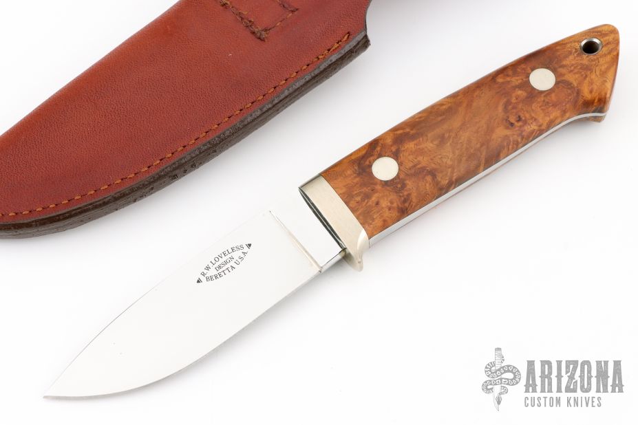 This R.W. Loveless design Drop Point Hunter by Beretta features a mirror polished drop point blade with .188" blade stock and 1.073" blade depth. The handle is comprised of a nickel silver guard and Quince wood scales over full tapered tang construction. Lanyard tube in pommel. Comes with a brown leather sheath and original box. Excellent condition.