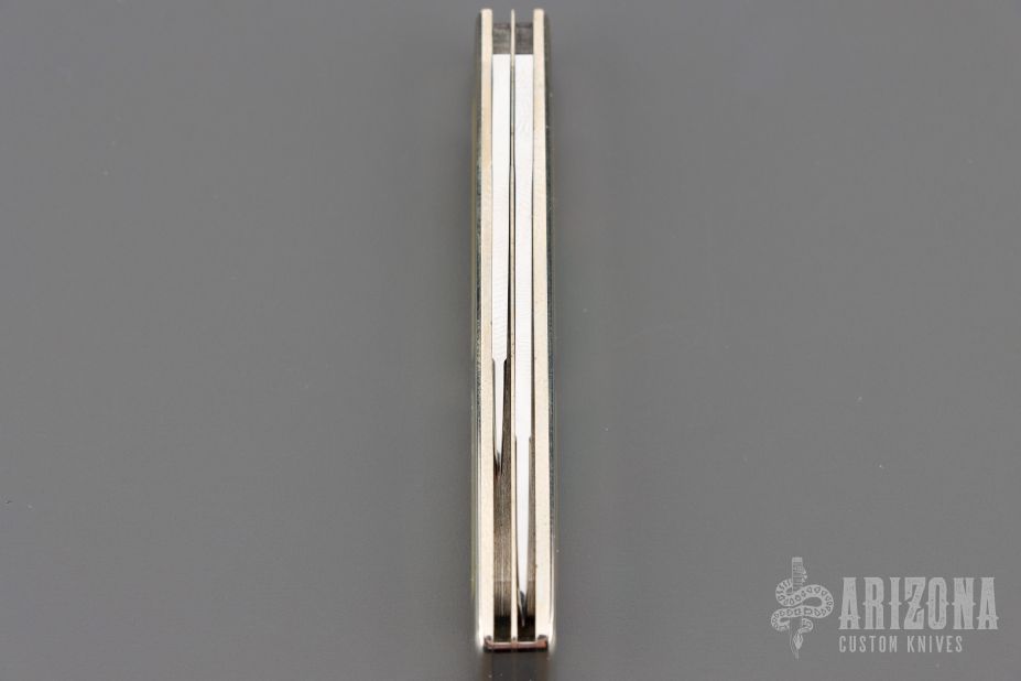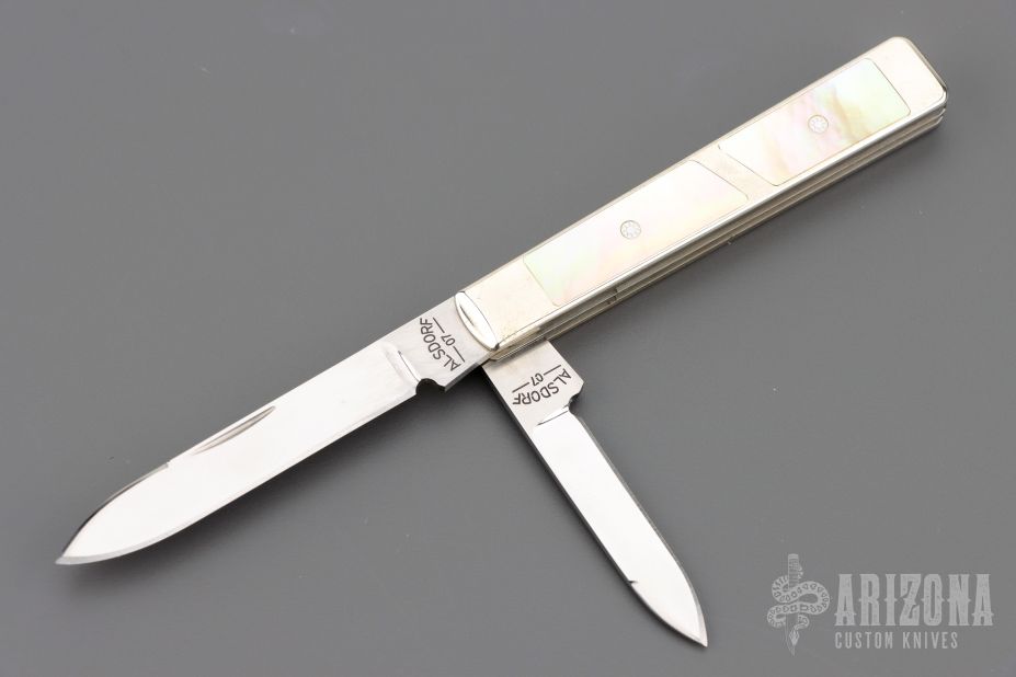 This 2-Blade Interframe Doctor's Knife Mike Alsdorf features mirror finished drop point blades with nail nicks. The handle has nickel silver covers with gold lip pearl inlays, a nickel silver escutcheon and center liner, stainless steel springs. Has half-stop, flush in all positions. Includes leather slip pouch. Excellent condition. Dated 2006.