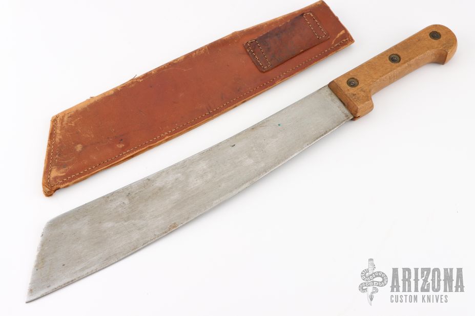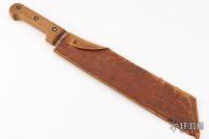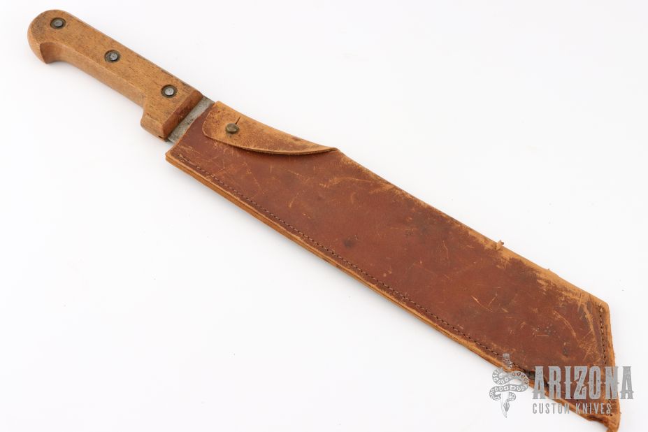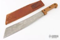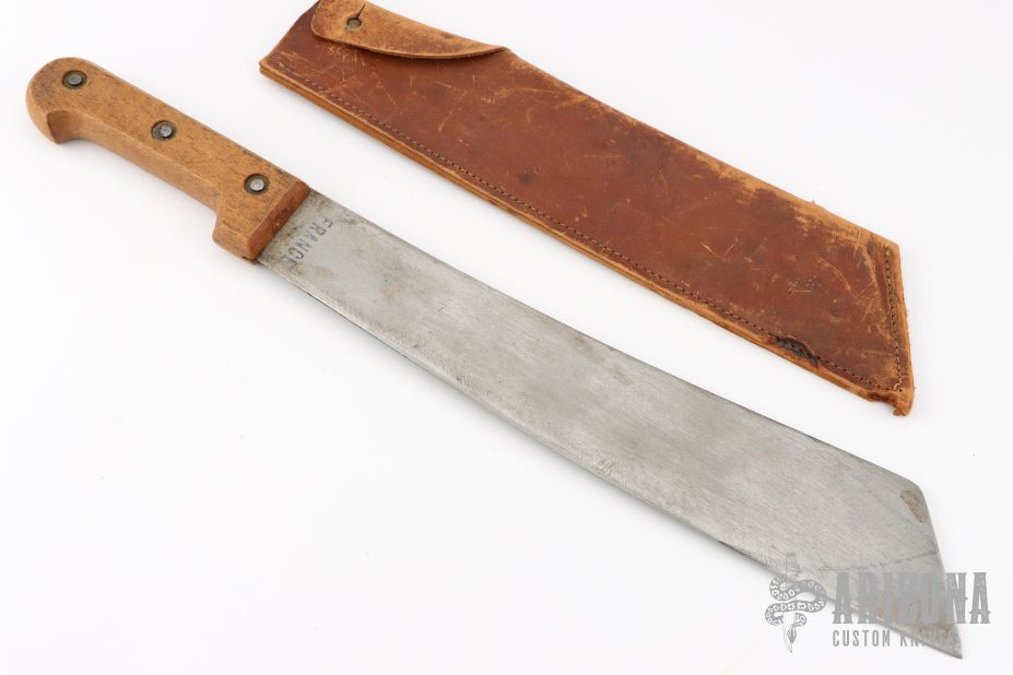 This French Machete features a satin finished blade with .194" blade stock and 2.686" blade depth, full tang construction. The handle has wood scales. Comes with a brown leather sheath. Has some scratches and oxidation, otherwise good condition.