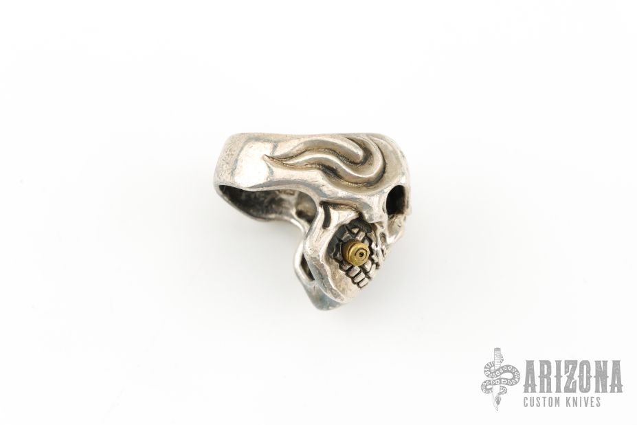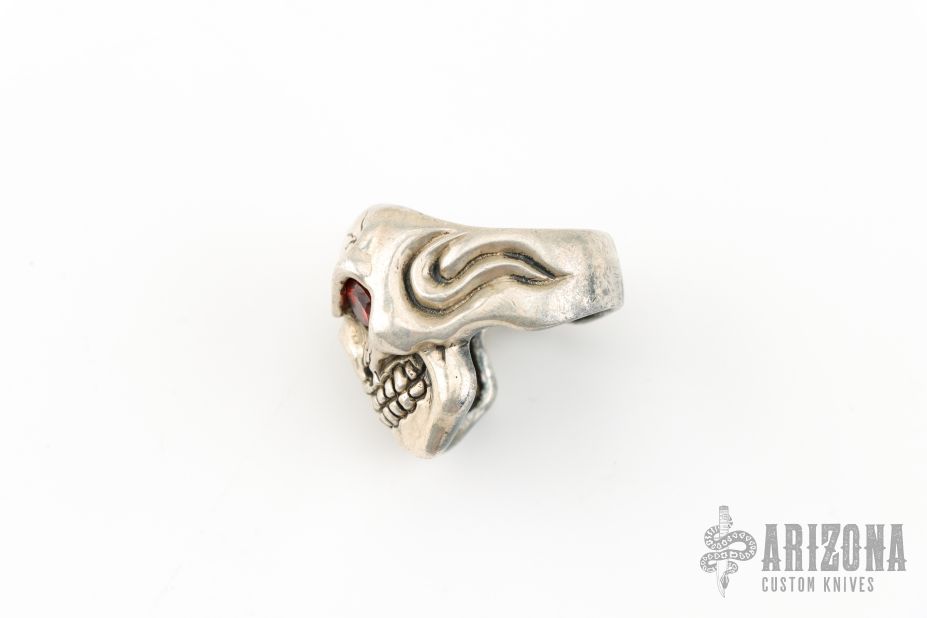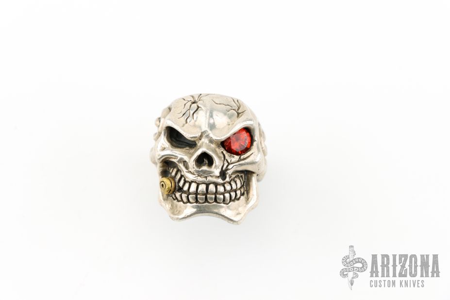 Silver skull ring with stone eye, and brass cigar. Size 10. Purchased from Camden market in London. Has some patina, otherwise excellent condition.