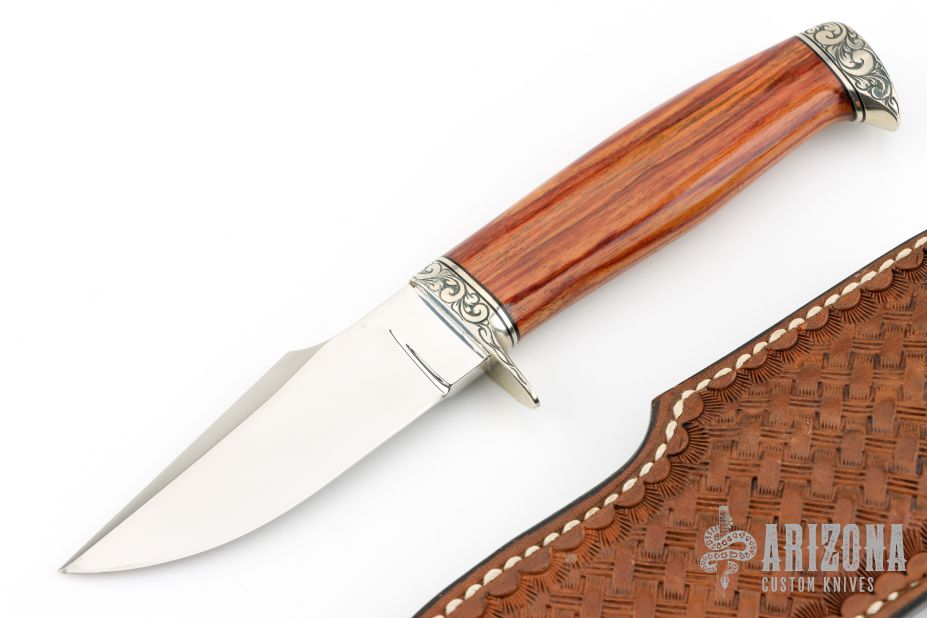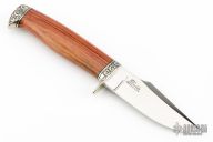 This Knife by D'Alton Holder features a mirror polished blade with false top edge, .202" blade thickness and 1.110" blade depth, hidden tang construction. The handle has an engraved nickel silver guard and butt, wood grip with with black and nickel silver spacers. Comes with a hand tooled brown leather sheath and a zippered case. Excellent condition.