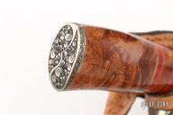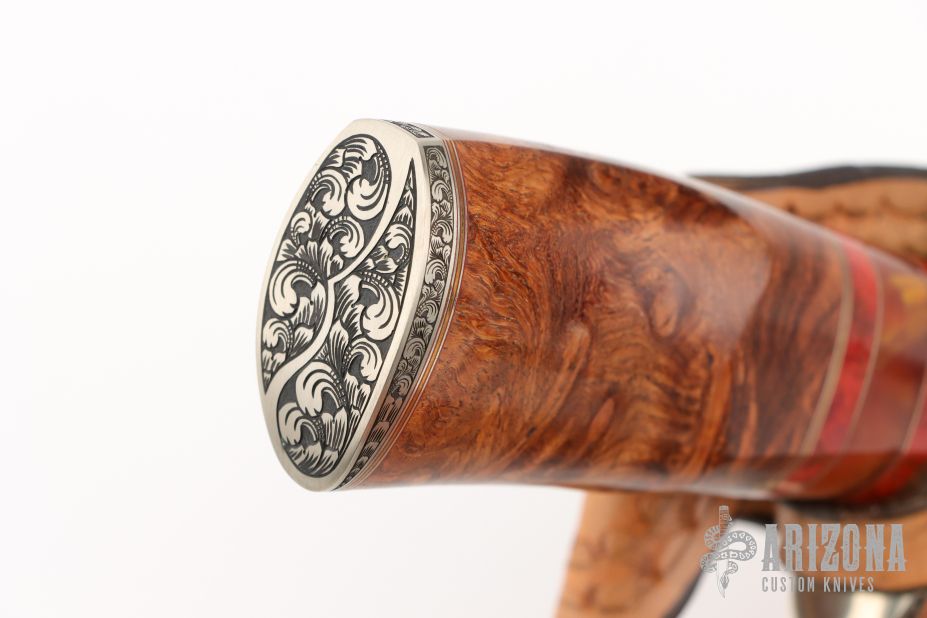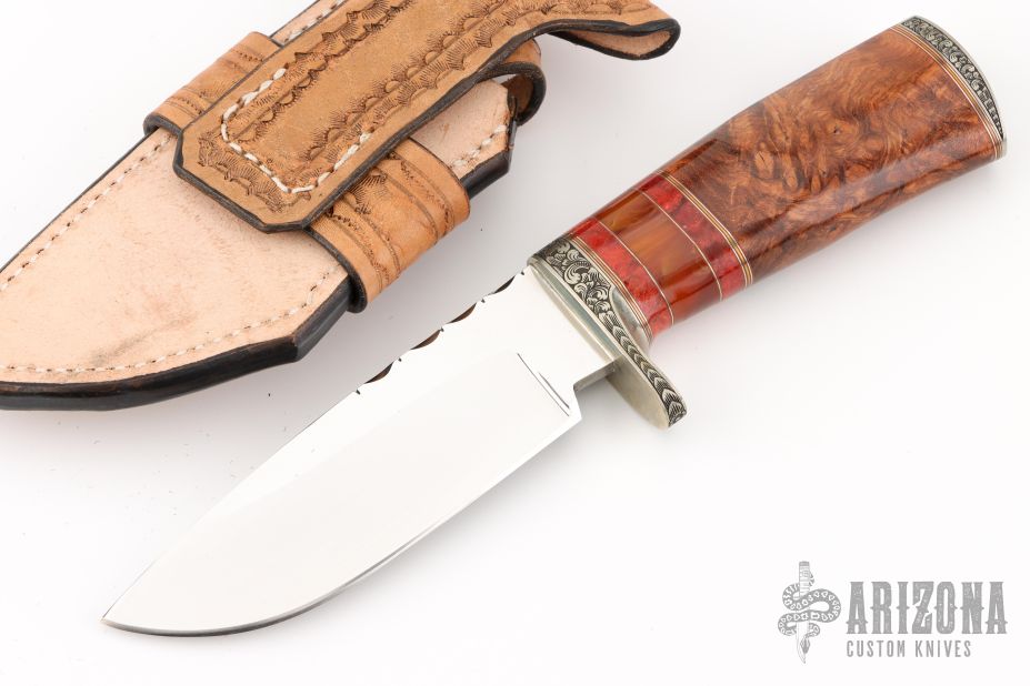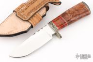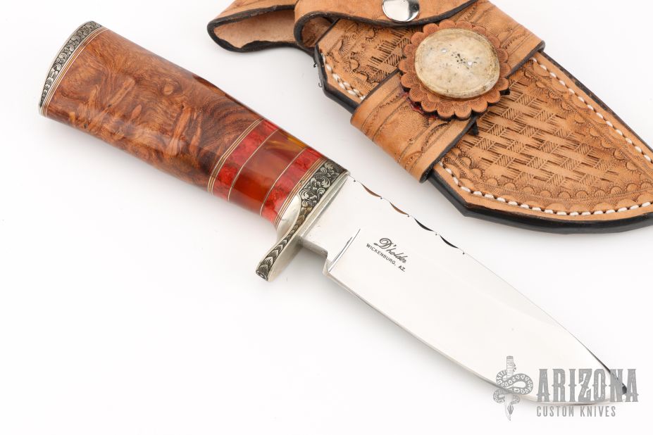 This Knife by D'Alton Holder features a mirror polished blade with fileworked spine, .237" blade thickness and 1.558" blade depth, hidden tang construction. The handle has an engraved nickel silver guard and butt, wood grip, red/nickel silver/brass/burl wood/amber spacers. Comes with a hand tooled brown leather sheath and a zippered case. Excellent condition.