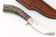 This Knife by D'Alton Holder features a mirror polished blade with .194" blade thickness and 1.036" blade depth, hidden tang construction. The handle has a nickel silver guard and butt, impala horn grip, black/nickel silver/stone spacers. Comes with a hand tooled brown leather sheath and a zippered case. Excellent condition.