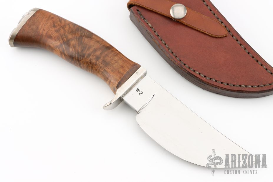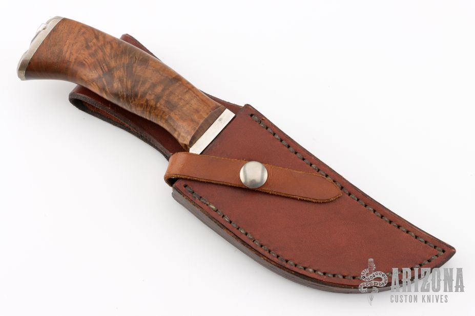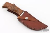 This knife by Master Smith Hanford Miller features a hand forged mirror polished drop point blade with .262" blade stock and 1.609" blade depth, hidden tang construction. The handle has a nickel silver guard and fileworked butt, a walnut grip. Comes with a brown leather sheath. Excellent condition.