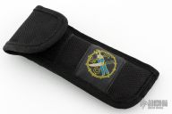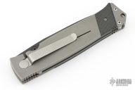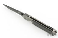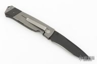This framelock folder is a collaboration between Walter Brend and Cutters Knife & Tool. The knife has a black blade with a single thumbstud. The handle has a blasted titanium frame with carbon fiber inlays. Stainless steel tip down clip. Notches on thumbrest and rear of frame. Smooth action with a nice detent, lockup and blade seating. Numbered #0143on blade spine. Has a scratch under the clip, otherwise excellent condition. Comes with original sheath.
