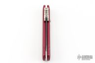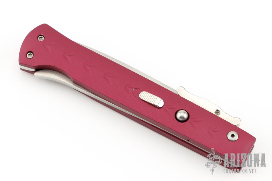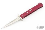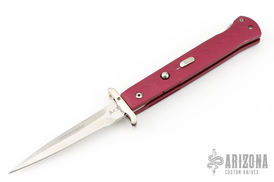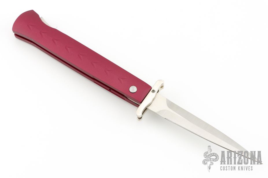 This Phantom Italian swing guard automatic by Dynamic Knife Designs has a satin finish blade and red aluminum handle. Features a ramped side positioned stainless steel safety just below the firing button. False top edge. Button release/single action with closure via the rear positioned lockbar release. Dual leaf and coil spring action providing an extremely fast opening. When closed, the dual guard rests on the frame, encompassing the blade tang. Upon opening, the guard swings into a locked position. Excellent condition.