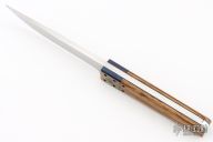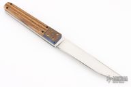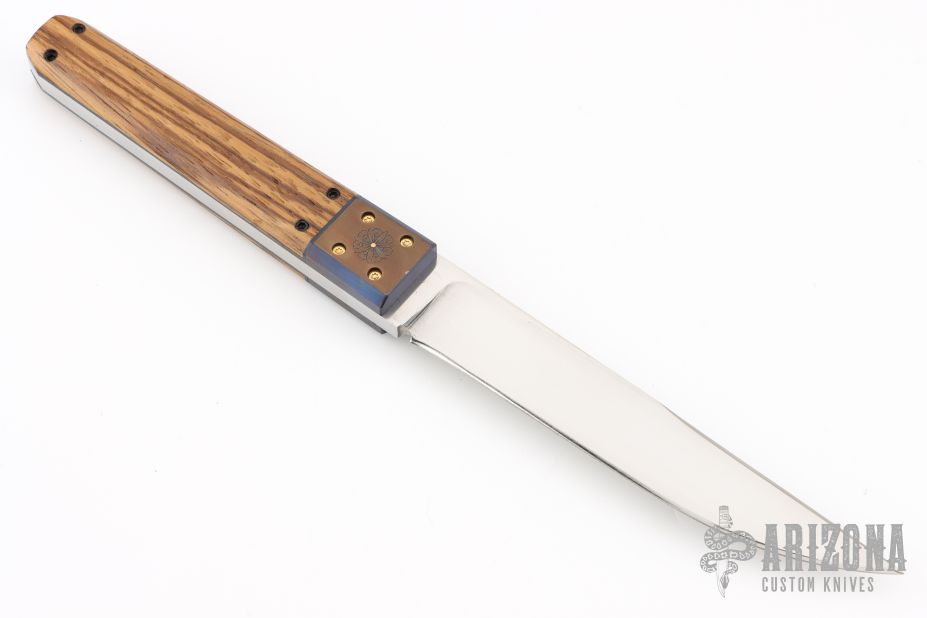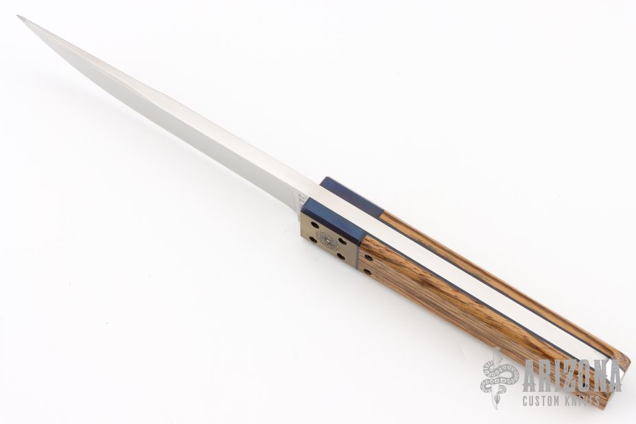 This Kwaiken by Jeffrey Harkins features a hand rub satin finished blade with false top edge, .246" blade stock and .937" blade depth, full tang construction. The handle has anodized and engraved titanium bolsters with gold plated screws, zebra wood scales with blue liners and black screws. Comes with COA and a zippered case. Has a couple light scratches, otherwise excellent condition.