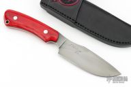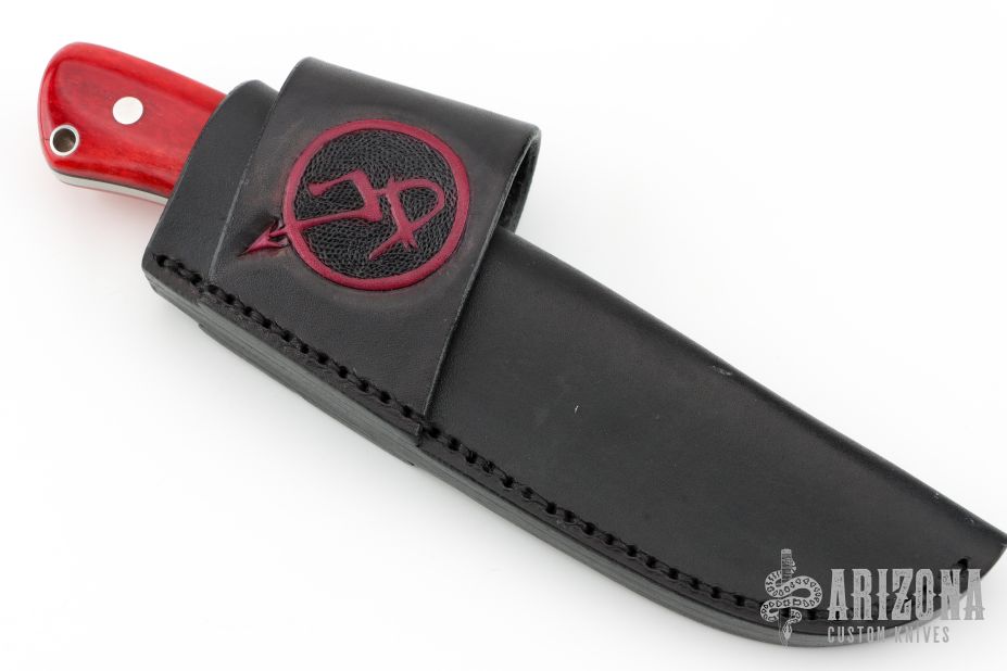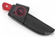 This knife by Master Smith J Neilson features a hand rub satin finished blade with hamon, .164" blade stock and 1.281" blade depth, full tang construction. The handle has red bone scales with black liners. Has a couple small spots on the blade, excellent condition otherwise. Comes with a black leather sheath with the Jersey Devil logo. This knife has the Jersey Devil logo on the blade. Comes with COA
