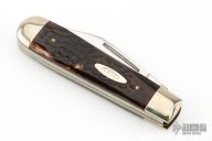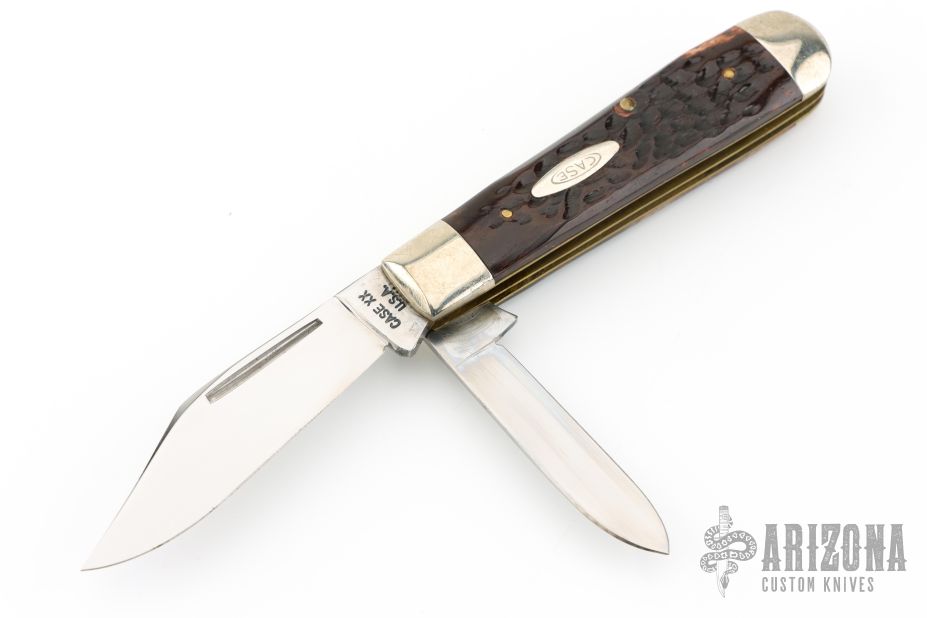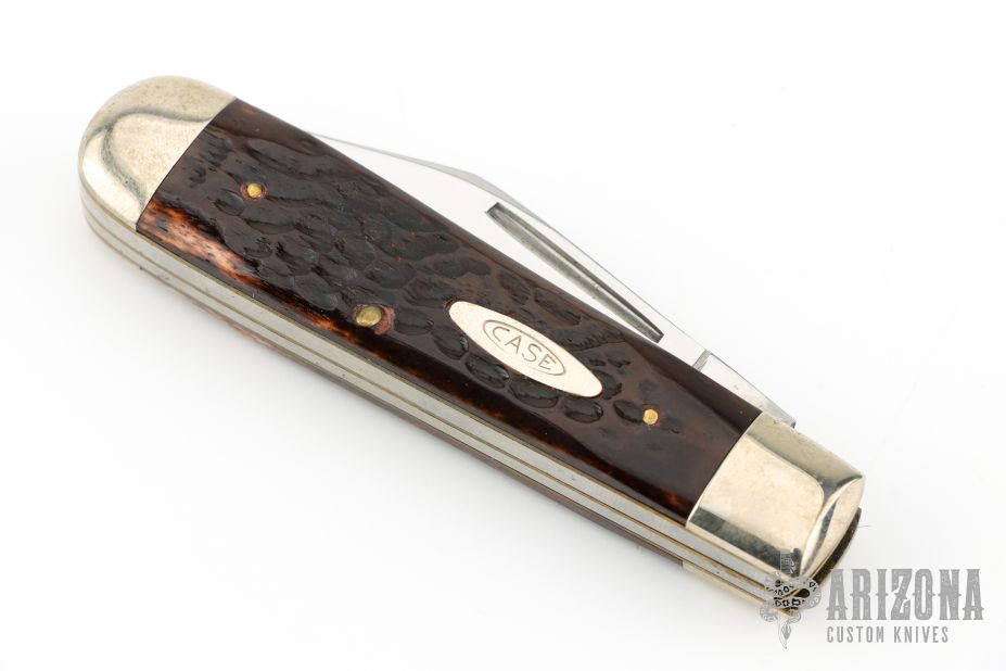 This 2-Blade Jack Knife by Case knives features polished blades with long pull and nail nick. The handle has nickel silver bolsters, jigged bone covers, brass liners and stainless springs. Has some light scuffs, scratches, and patina. Great condition for its age.