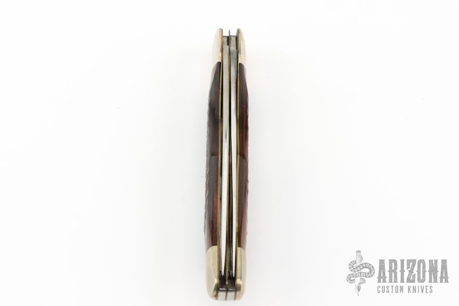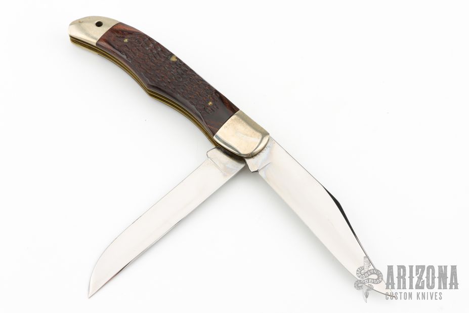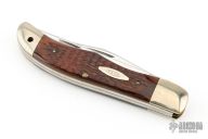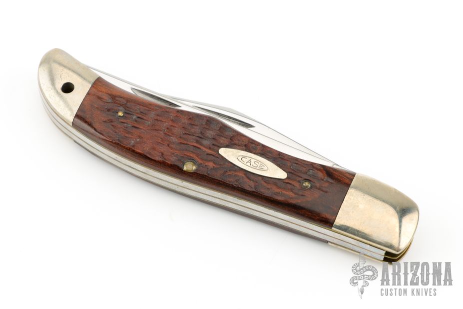 This vintage two blade slipjoint by Case with jigged wood covers and nickel silver bolsters, brass liners, stainless steel springs. Has satin finished blades with nail nicks. Has some light scuffs, scratches, and patina. Great condition otherwise. 1974