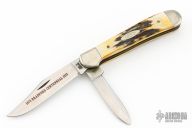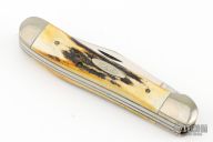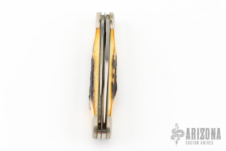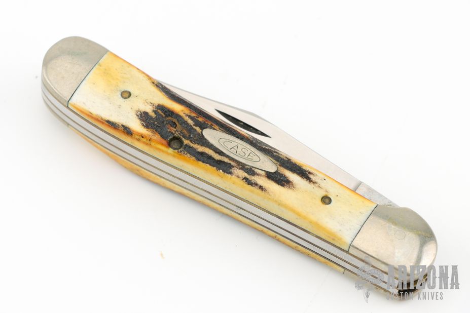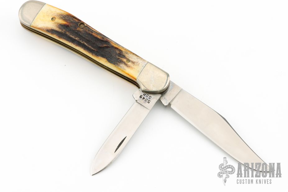 This Trapper by Case knives features polished blades with nail nicks. The handle has nickel silver bolsters, shield, stag covers, brass liners and stainless springs. Has some light scratches and patina, otherwise excellent condition.