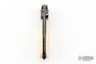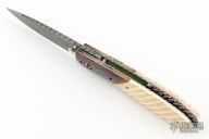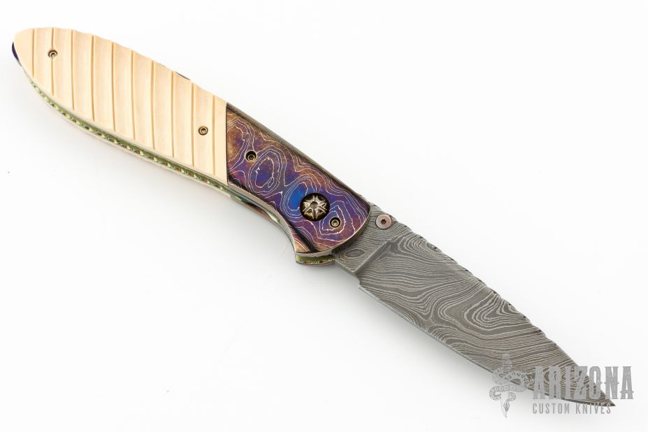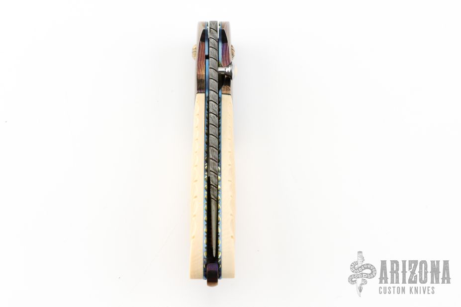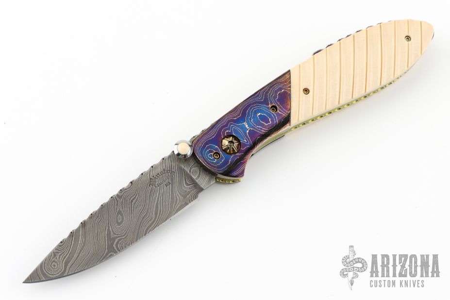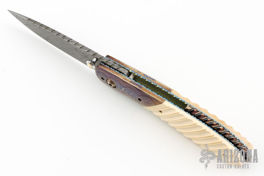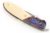 This linerlock by David Winston has a Damascus blade with a fileworked spine and a single thumbstud with mammoth ivory inlay. The handle has blued Damascus bolsters, fluted mammoth ivory scales, fileworked and two-tone anodized titanium liners, blued and fileworked stainless steel backspacer. Nice detent and lockup. Comes with a zippered case. Excellent condition.