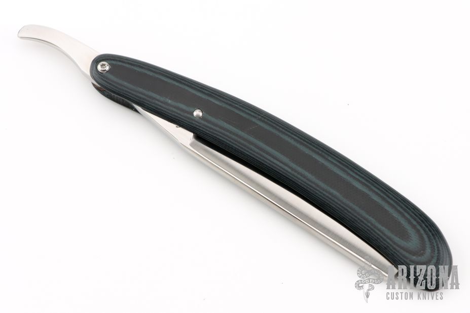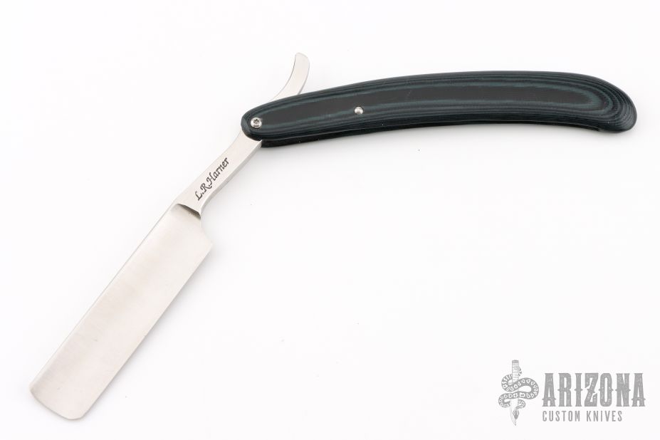 This Straight Razor by LR Butch Harner features a satin finished hollow ground blade. The handle is black/green G-10. Comes with a zippered case and COA dated 6-6-08. Excellent condition.