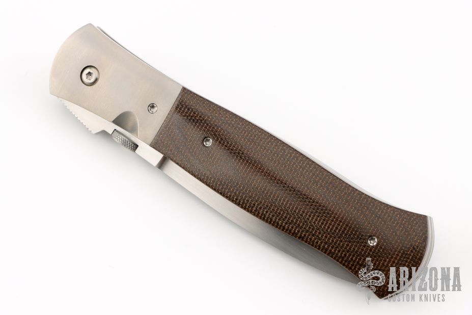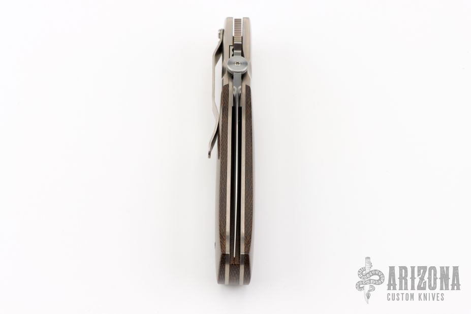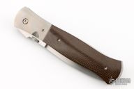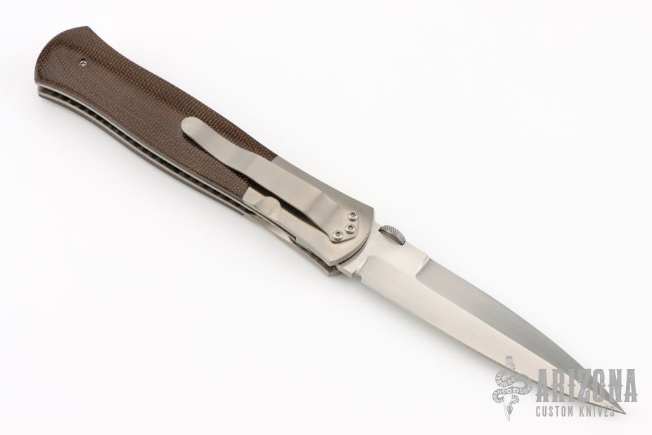 This linerlock Folding Dagger from John W. Smith features a hand-rubbed satin finish blade with false top edge, notched thumbrest, and thumb disc. The handle has satin finished titanium bolsters, green canvas micarta scales, titanium liners and tip down clip. Nice detent, blade seating and lockup. Excellent condition. Comes with a zippered case.