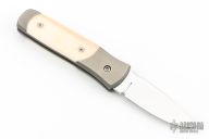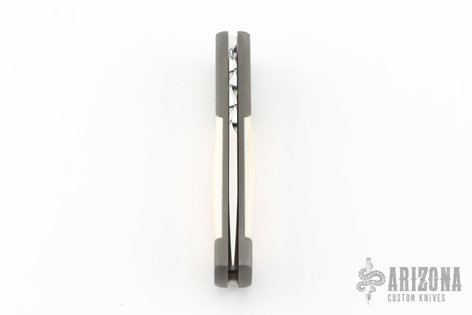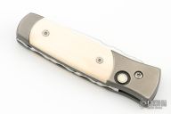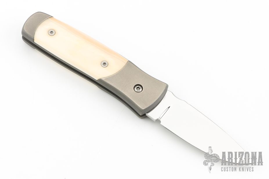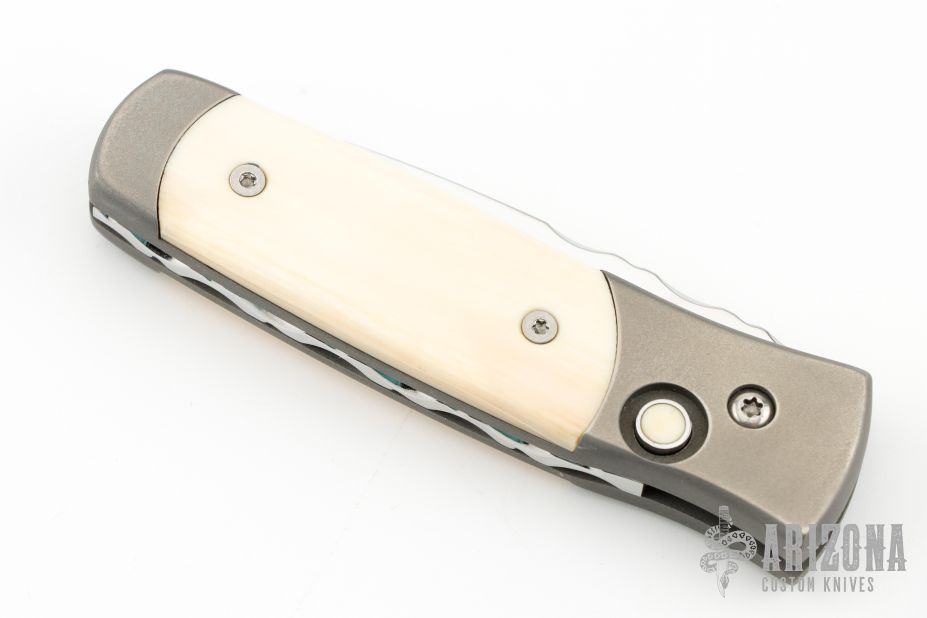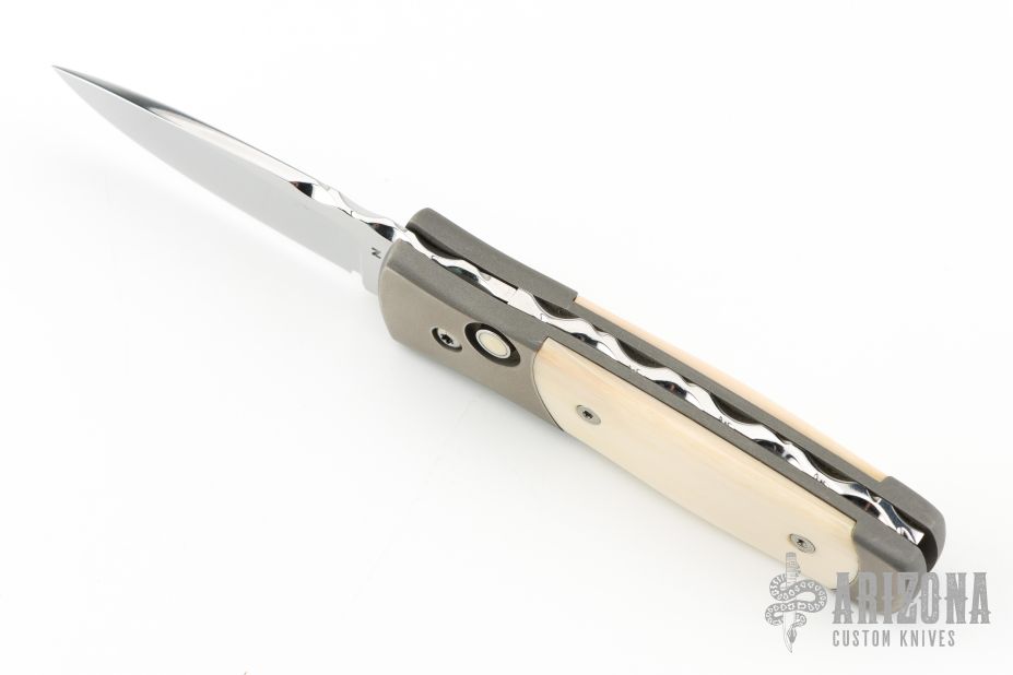 This Automatic by Z Custom Knives features a mirror polished drop point blade with fileworked thumbrest. The handle has a bead blasted titanium frame with mammoth ivory inlays and inlaid push button over a fileworked stainless steel backspacer. Has a small spot on the blade, otherwise excellent condition. Hard to find! Comes with a zippered case.