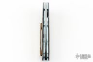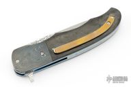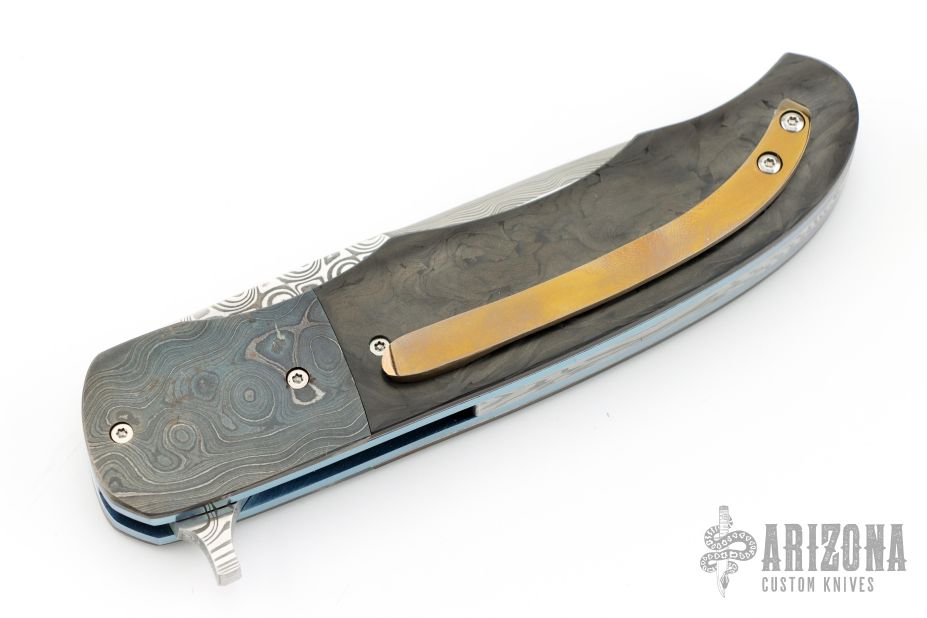 This Linerlock Flipper by George Muller features a Damascus blade with flipper. The handle has dovetailed Damascus bolsters, marble carbon fiber scales with black and white liners, anodized titanium liners, Damascus backspacer, anodized titanium tip up clip. Nice detent, blade seating and lockup. Has bearings. Comes with zippered case. Ha a couple light scratches, otherwise excellent condition.