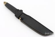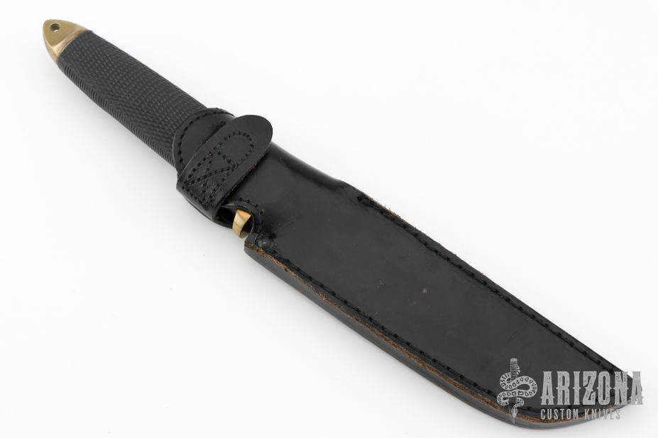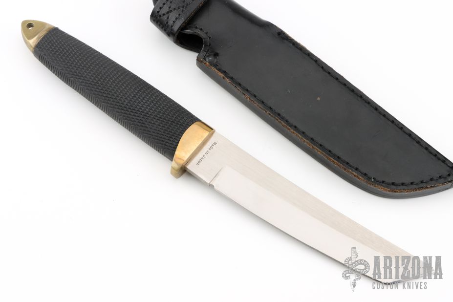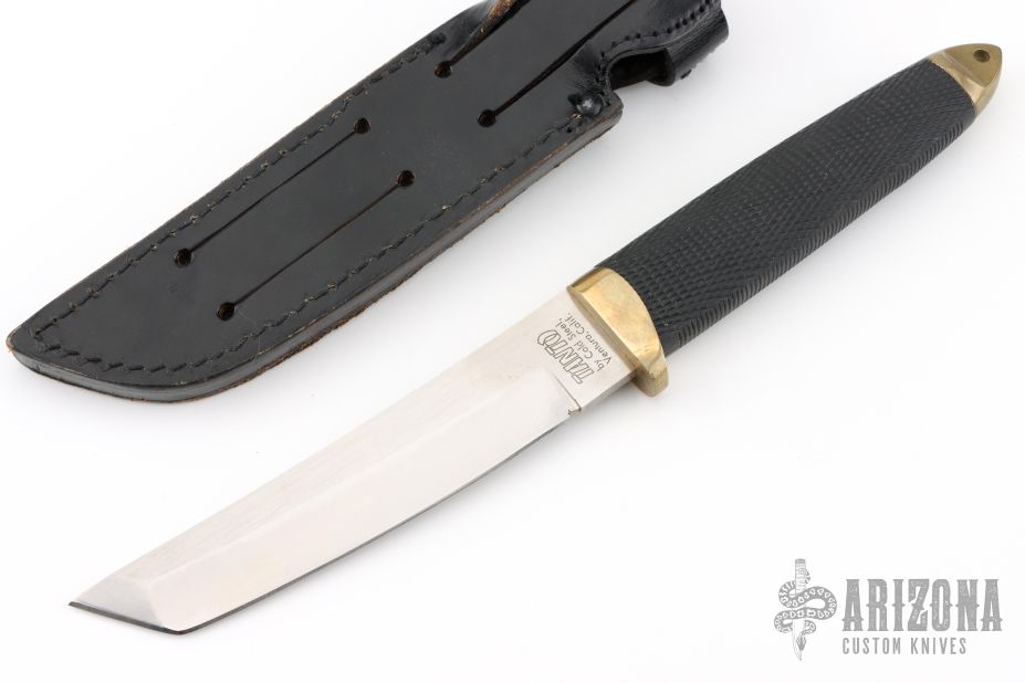 This Tanto by Cold Steel features a satin finished tanto blade with .186" blade stock and 1.134" blade depth, hidden tang construction. The handle has a brass guard and butt with rubber grip. Has a few light scuffs, and patina otherwise Excellent condition. Comes with original black leather sheath.