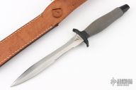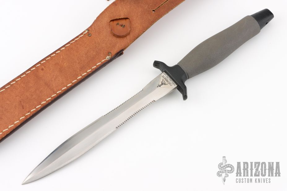 The Mark II is one of the best selling knives of all time. First introduced in 1966, this tactical knife is serialized for collectors. This one has a satin finished double edged partially serrated blade, .236" blade stock and .875" blade depth, hidden tang construction with a black/grey aluminum handle. This knife is Serial #025140 and was made in 1972. Comes with original brown leather sheath and papers. Has a couple light scuffs and scratches, excellent condition for its age. Appears to have been sharpened.