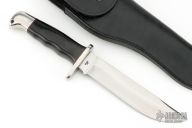 This Frontiersman by Buck features a satin blade and black linen micarta scales. Aluminum rear bolsters and guard. Full tang construction with .187" thickness and depth of 1.396". Comes with original box, papers, and black leather sheath. Has some scuffs and scratches great condition otherwise.