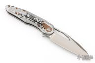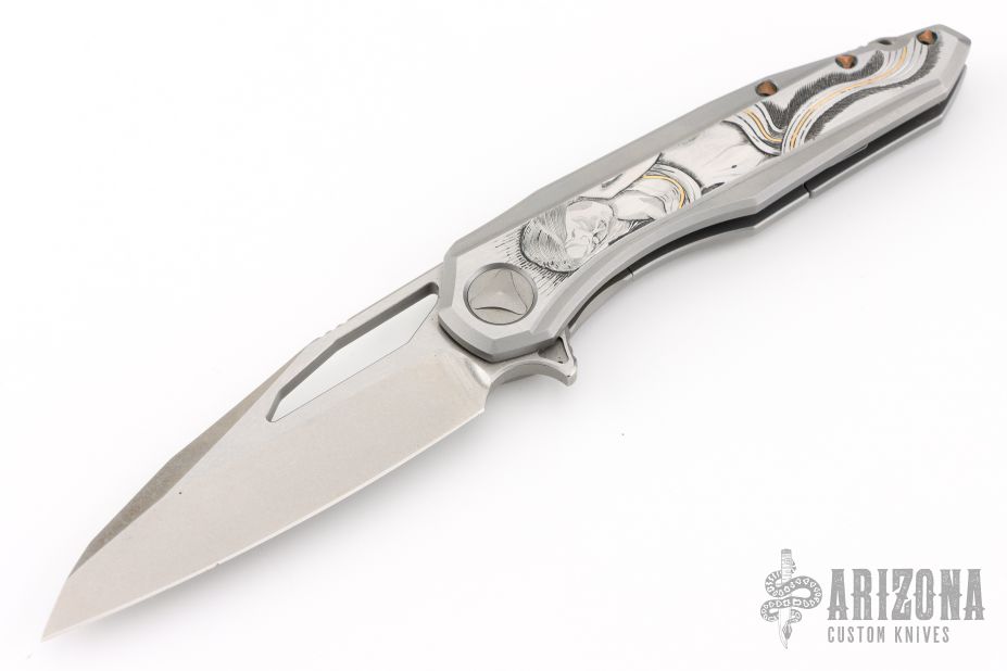 This Collaboration Sigil is by Deryk Munroe and Anthony Marfione. Features a two-tone stonewashed blade with satin flats, thumb hole and flipper, notched thumbrest. The handle has an engraved Roy Alloy stainless steel frame with 24kt gold inlays, a stainless lockbar and a titanium tip up retractable clip, titanium backspacer, copper plate and hardware, stainless lockface insert. Marked Anthony Marfione and Deryk Munroe and dated 03/2016. Has one very small scratch on the frame, otherwise excellent condition. Comes with original box, zippered case and COA.