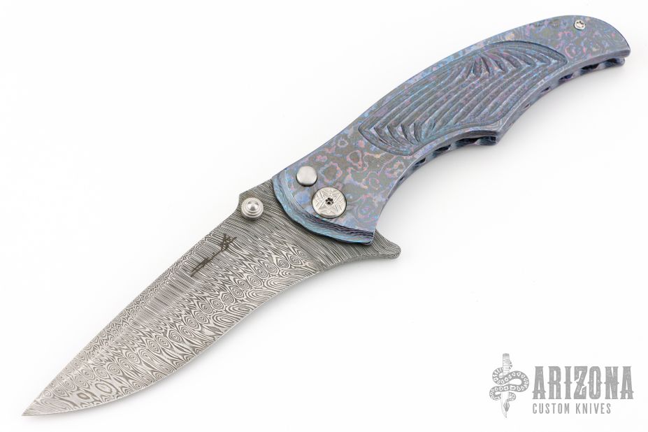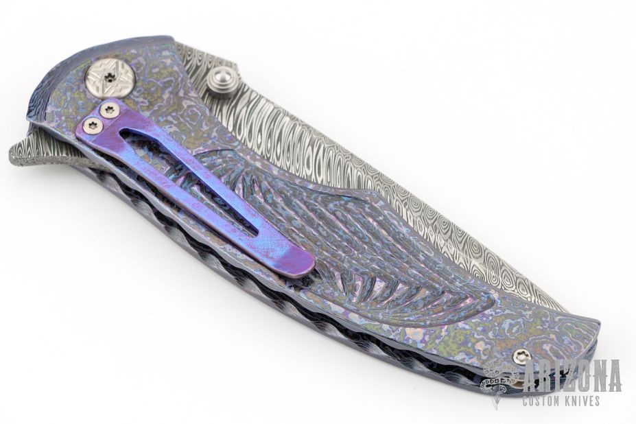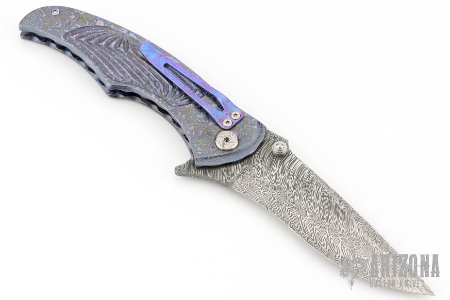 This Tighe Down Button Lock Flipper by Brian Tighe features a Damasteel blade with thumb ramp, flipper and dual thumbstuds. The handle has timascus covers, file work, and titanium standoff with an anodized titanium tip-down clip. Comes with a zippered case. Excellent condition.
