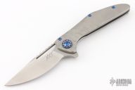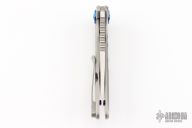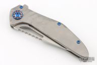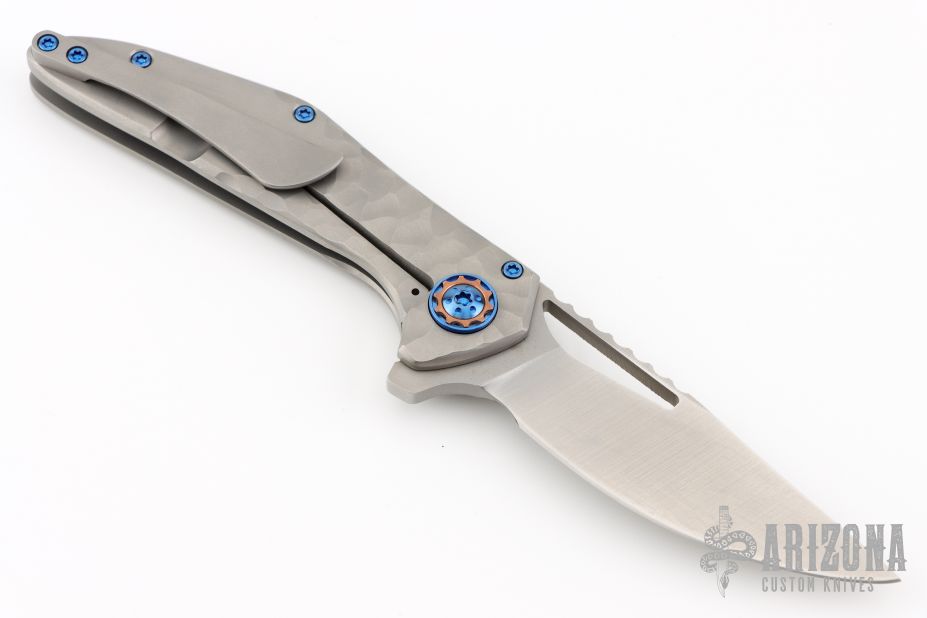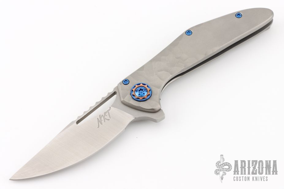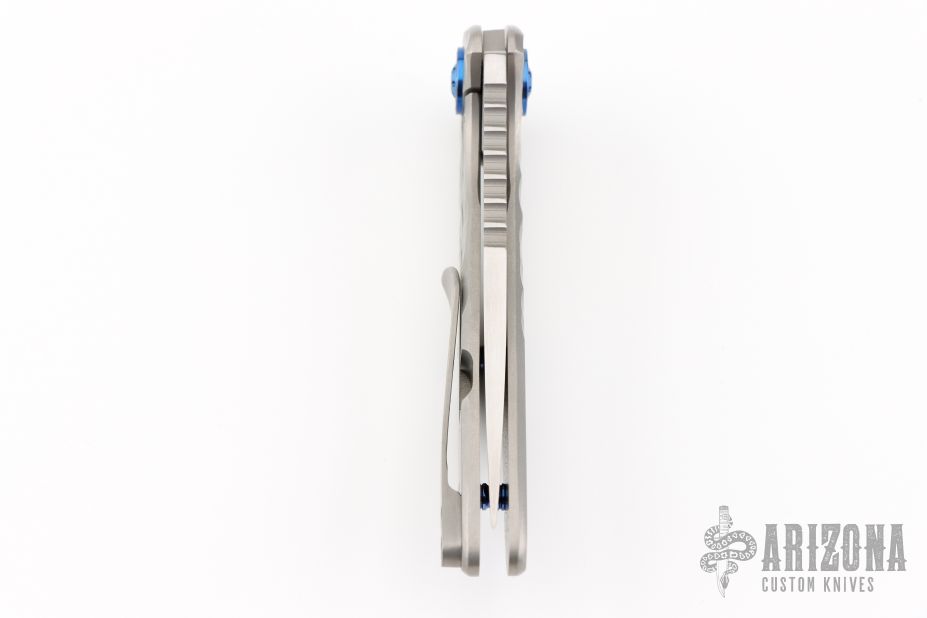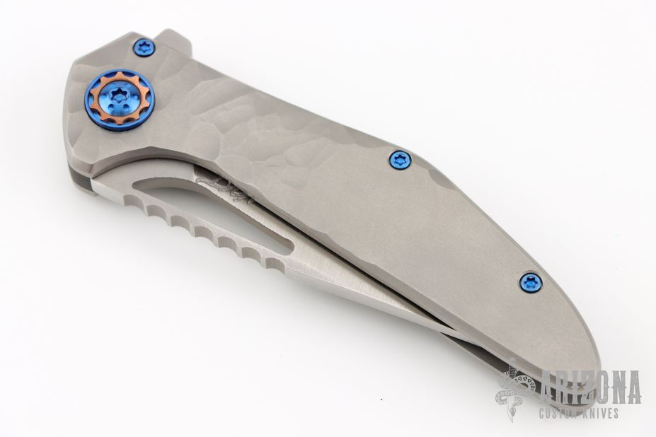 The Hydra is the culmination of many years of machining and learning knife making skills from Jonathan Neely. This knife is completely hand made and features a Rock Texture Flowing to Smooth Titanium Frame with Blue Anodized Titanium Hardware, Copper Pivot Collar, and 5/32" thick MagnaCut blade that Rockwells at 62Rc.