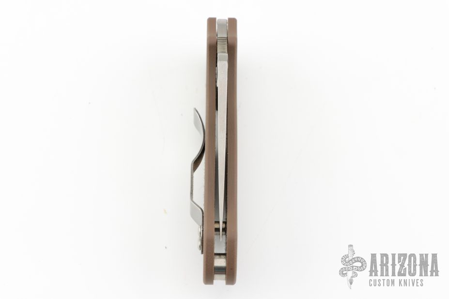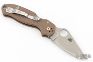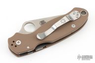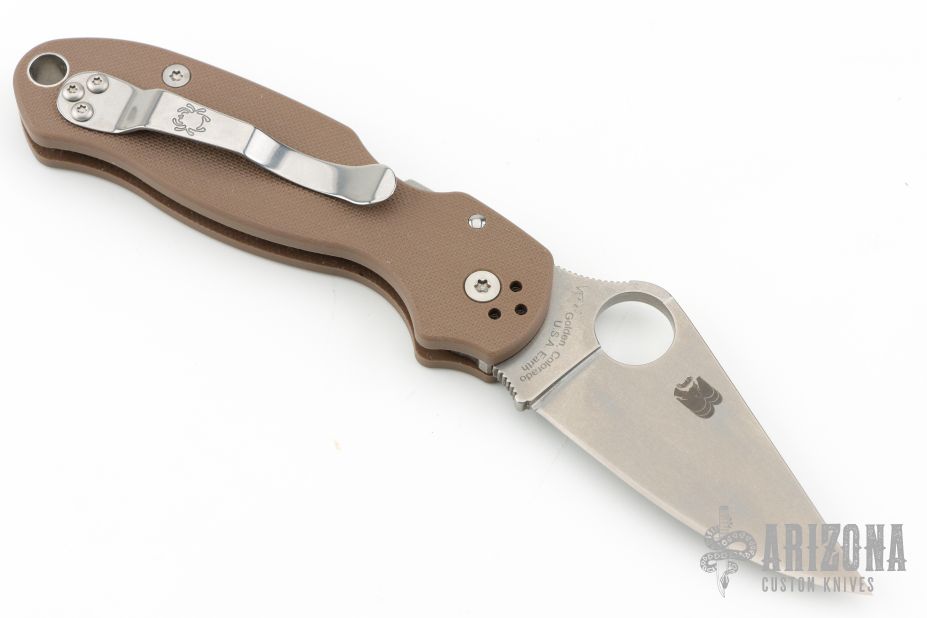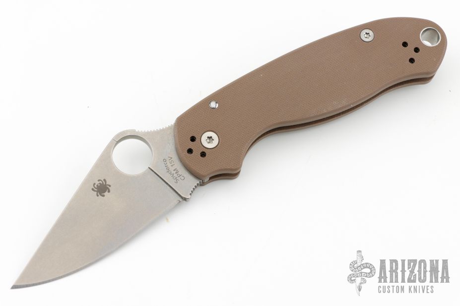 This C223GPBN Para 3 by Spyderco features a stonewashed clip point blade with thumb hole and notched thumbrest. The handle has a brown G-10 frame over nested steel liner and stand offs. The steel pocket clip is 4 way adjustable. Includes original box and paperwork. Blade Steel CPM 15V. Excellent condition.