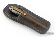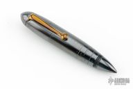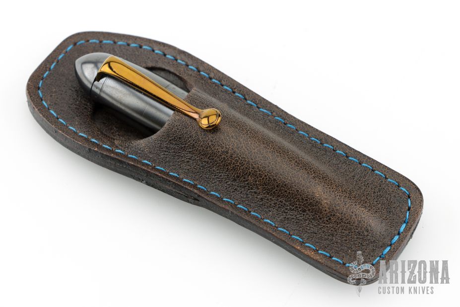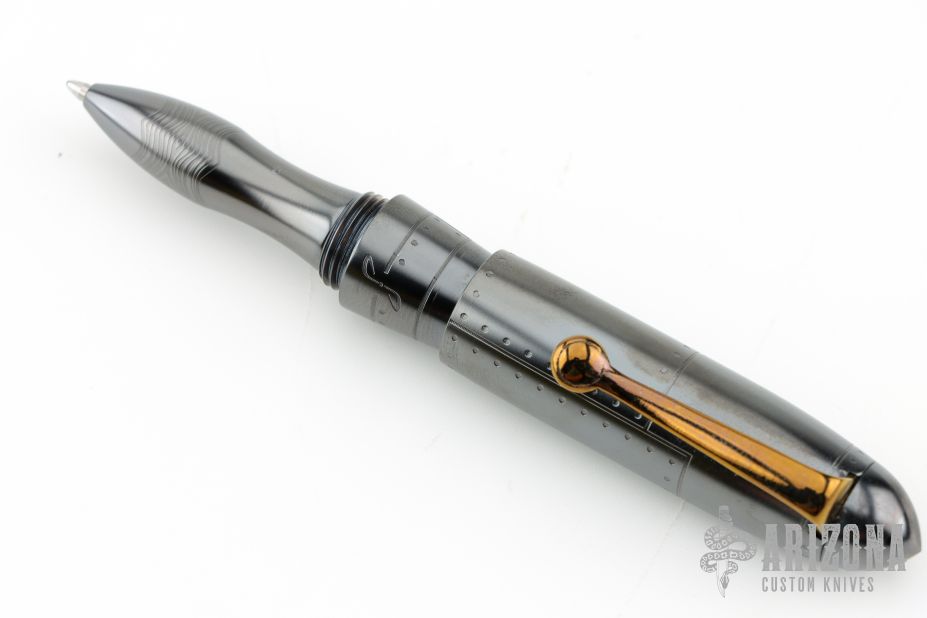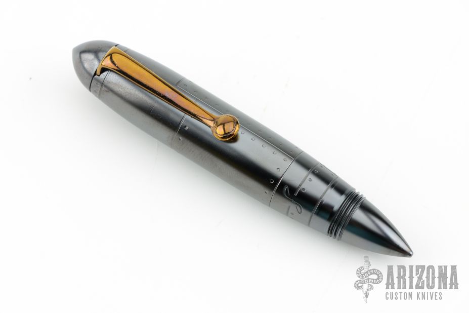 This Zeppelin Pen from Dmitry Streltsov features an orange peel finished/darkened "Bomber Theme" titanium body and pocket clip. Tip unscrews and turns around to screw in and reveal the pen tip. Comes with original sheath. Excellent condition.