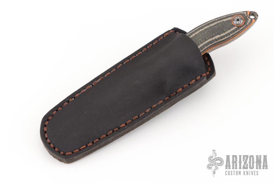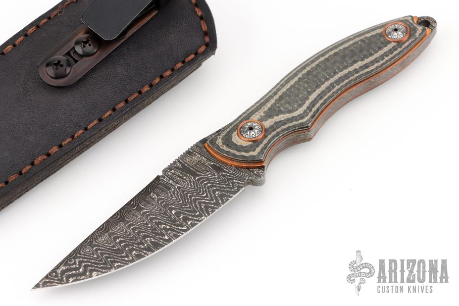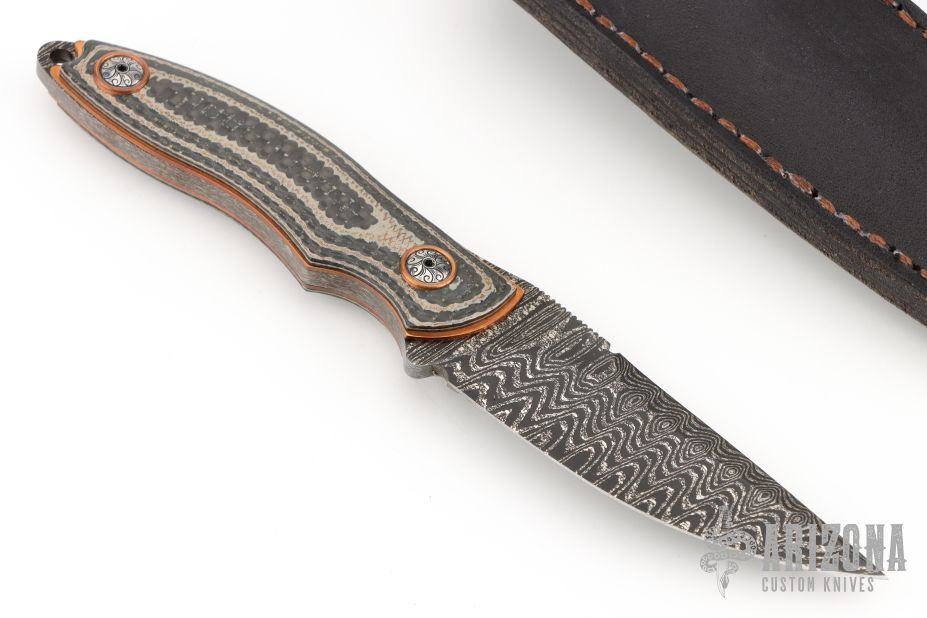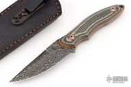 This one of a kind knife by Hennie Du Plessis features a carbon Damascus blade with notched thumbrest, .148" blade stock and 1.078" blade depth, full tang construction. The handle has copper liners, carbon fiber covers with copper hardware surrounds, and lanyard hole in pommel. Comes with a leather sheath, micro fiber cloth, and padded zipper case. Excellent condition.