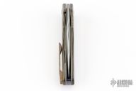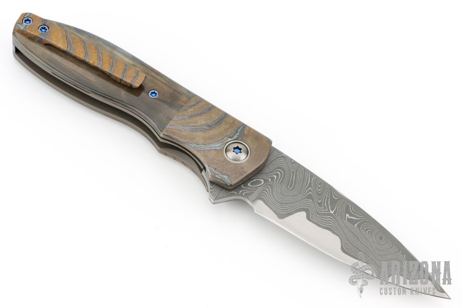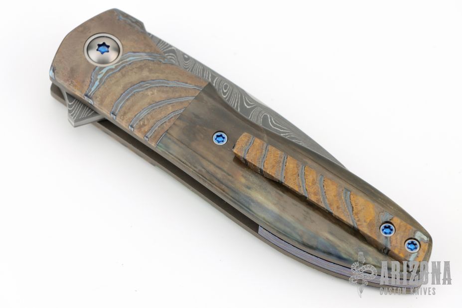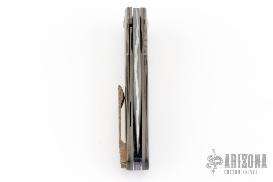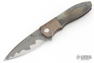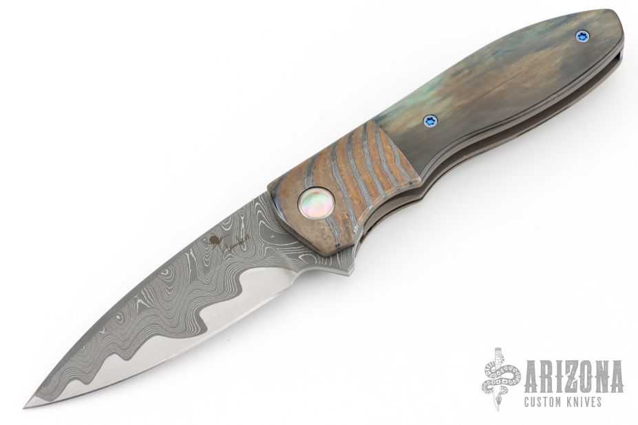 This Blitz flipper by Kirby Lambert features a Nichols Armorcore Damascus blade.  The bolsters are crystallized Ti/Zirc Damascus with matching tip up pocket clip , mammoth ivory scales, titanium liners and a black timascus backspacer. Black lip pearl inlaid into the pivot.  Blade is centered when closed, flips well with no wrist action needed, and solid lockup. Includes a padded zippered case and COA.  New from maker!